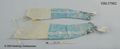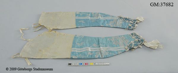 3-4: Två lösa ärmar i samma siden som övriga delar. Vänster ärm är :3 och höger ärm :4. Ärmarna är svängda och över armbågen skarvad med ett enklare ofärgat sidentyg. Ärmarna är i det blå sidenet skurna i tre delar och den skarvade delen i två. I ärmens övre öppning sitter fyra enklare sidenband (ca 16 cm lång) för fästning i kläderna. Ärmen är smal vid handleden men har ett 7 cm långt sprund i ena sidan. Ärmen är vid handleden kantad med likadana snömakeriband i ljusblått och vitt som kjolen. På insidan är en sydd kanal genom vilken det går ett mönstervävt vitt sidenband (2,5 cm brett) som knytes vid sprundet i rosett. Längd ärm yttre:52 cm, längd ärmdel i blått siden: 32cm, hel ärmlängd inkl rosett: 57cm, omkrets handled: 16cm, övre omkrets: 38 cm, omkrets ärmhål: 46 cm.