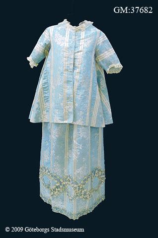Dräkt ljusblått vattrat sidenrips med mönstervävning i vitt med ränder och blommotiv. Består av kjol, jacka, två lösa ärmar och en bröstlapp eller ev. resttyg. Jackans vidd bl.a. gör att den misstänks ha tillhört en gravid kvinna.