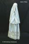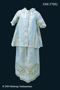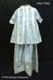 Dräkt ljusblått vattrat sidenrips med mönstervävning i vitt med ränder och blommotiv. Består av kjol, jacka, två lösa ärmar och en bröstlapp eller ev. resttyg. Jackans vidd bl.a. gör att den misstänks ha tillhört en gravid kvinna.