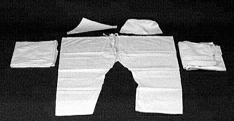 - Liksvepning för man; Judaica. Alla delar maskinsydda i vit bomullslärft. 1) SKJORTA, öppen fram. Uppstående krage, breda manschetter och ärmspjäll. Vita knytband vid halsen (i dragsko) och vid handlederna L: 97 Ärm: 62 cm. 2) BYXOR. Raka, med vitt bomullsband i dragsko i midjan. L: 105 Vidd: 174 cm. 3) MÖSSA. Rakt tygstycke rynkat kring en liten rundel högst upp. H: 27 Vidd: 68 cm. 4) Tresnibb att knyta om huvudet, under hakan. Längsta sida 125 cm. 5) Lakan= den yttersta svepningen. L: 248 Br: 150 cm