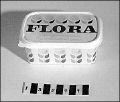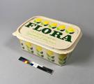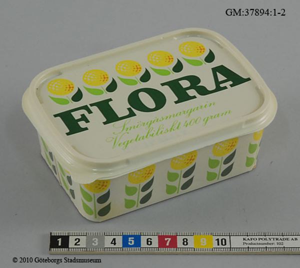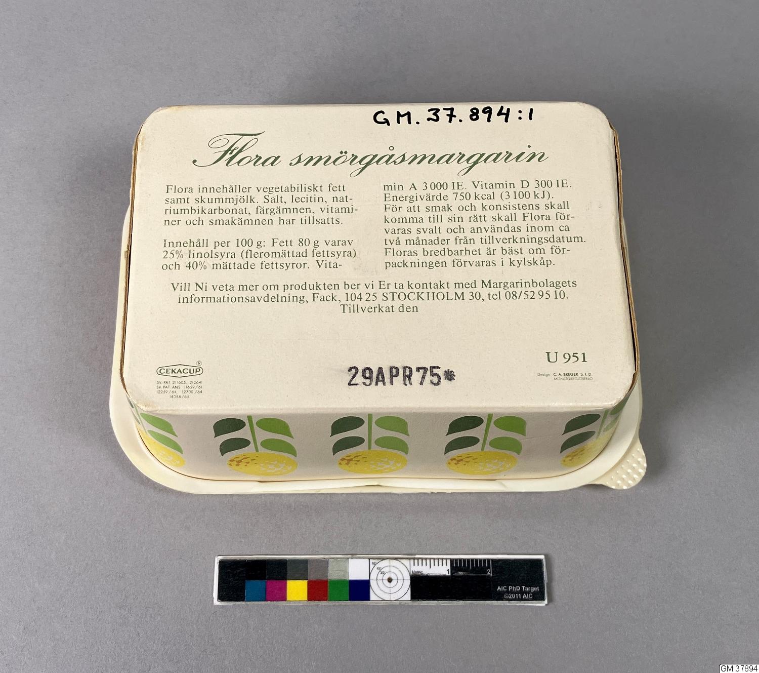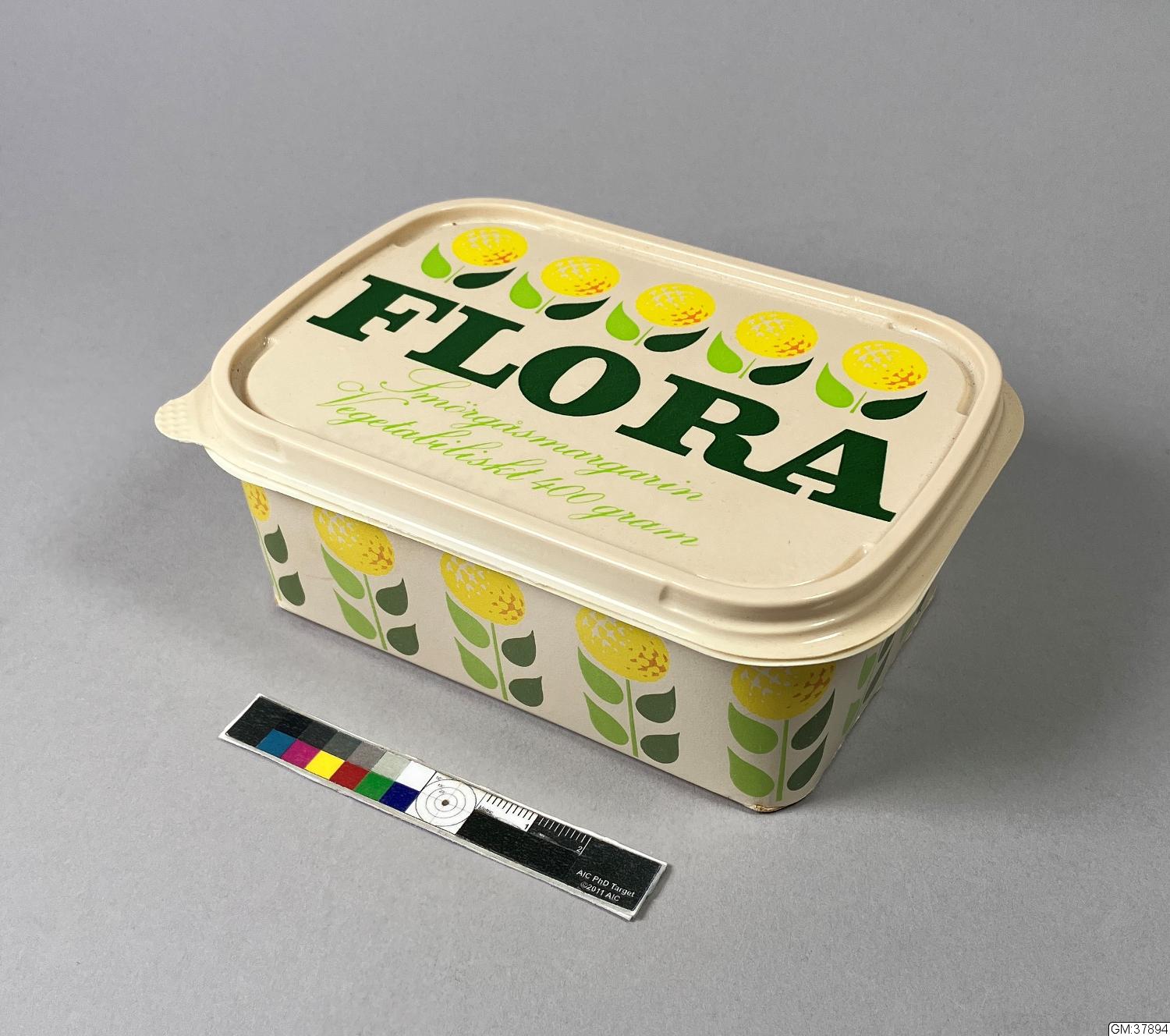 Margarinask av vit kartong, invändigt plastbelagd. Tryckt dekor runtom: stiliserade gula blommor med gröna blad. Under botten text "Flora smörgåsmargarin" samt varudeklaration och stämpel "29 apr 75". Lock av vit plast med blommor som föreg. samt text "FLORA Smörgåsmargarin Vegetabiliskt 400 gram" i grönt