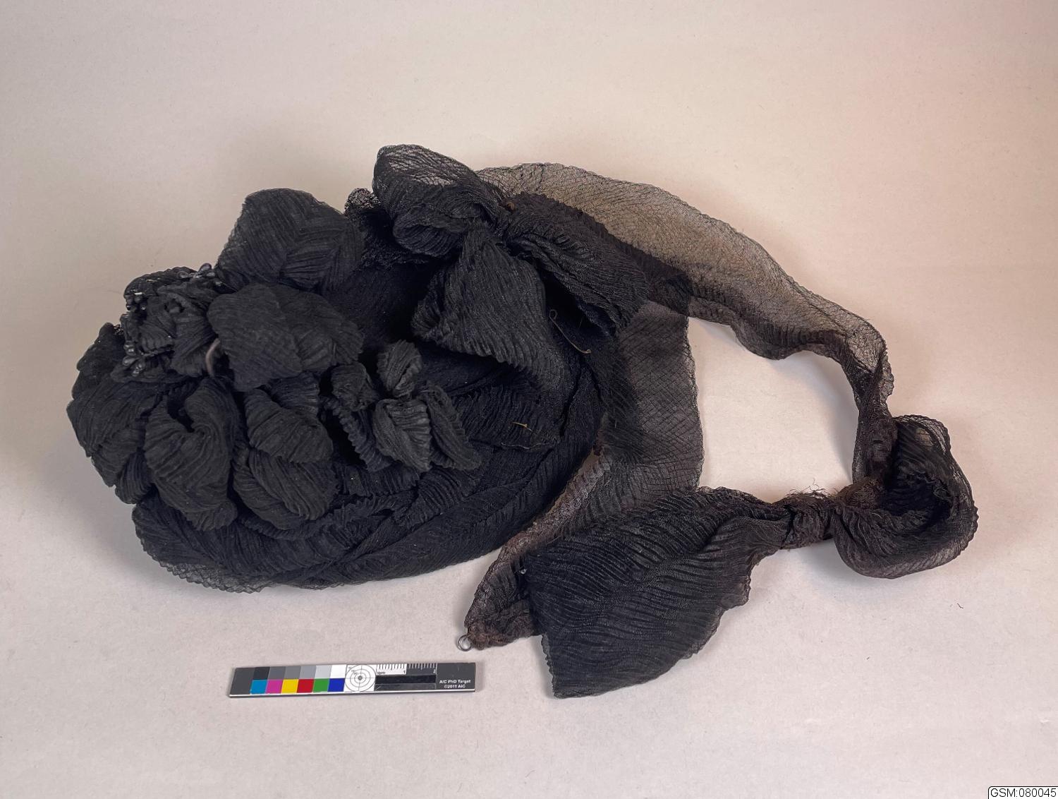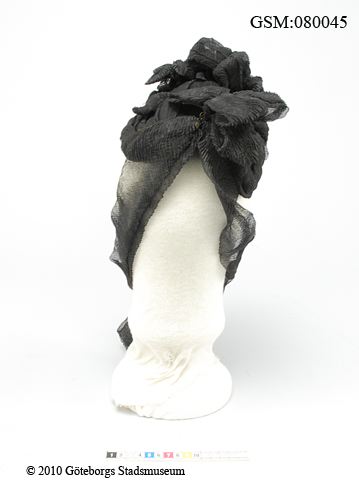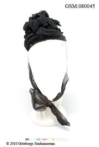 Liten Kapotthatt /nackhatt helt klädd med svart sorgcrepe. Dekorrosetter och långa hängband av sorgcrepe.