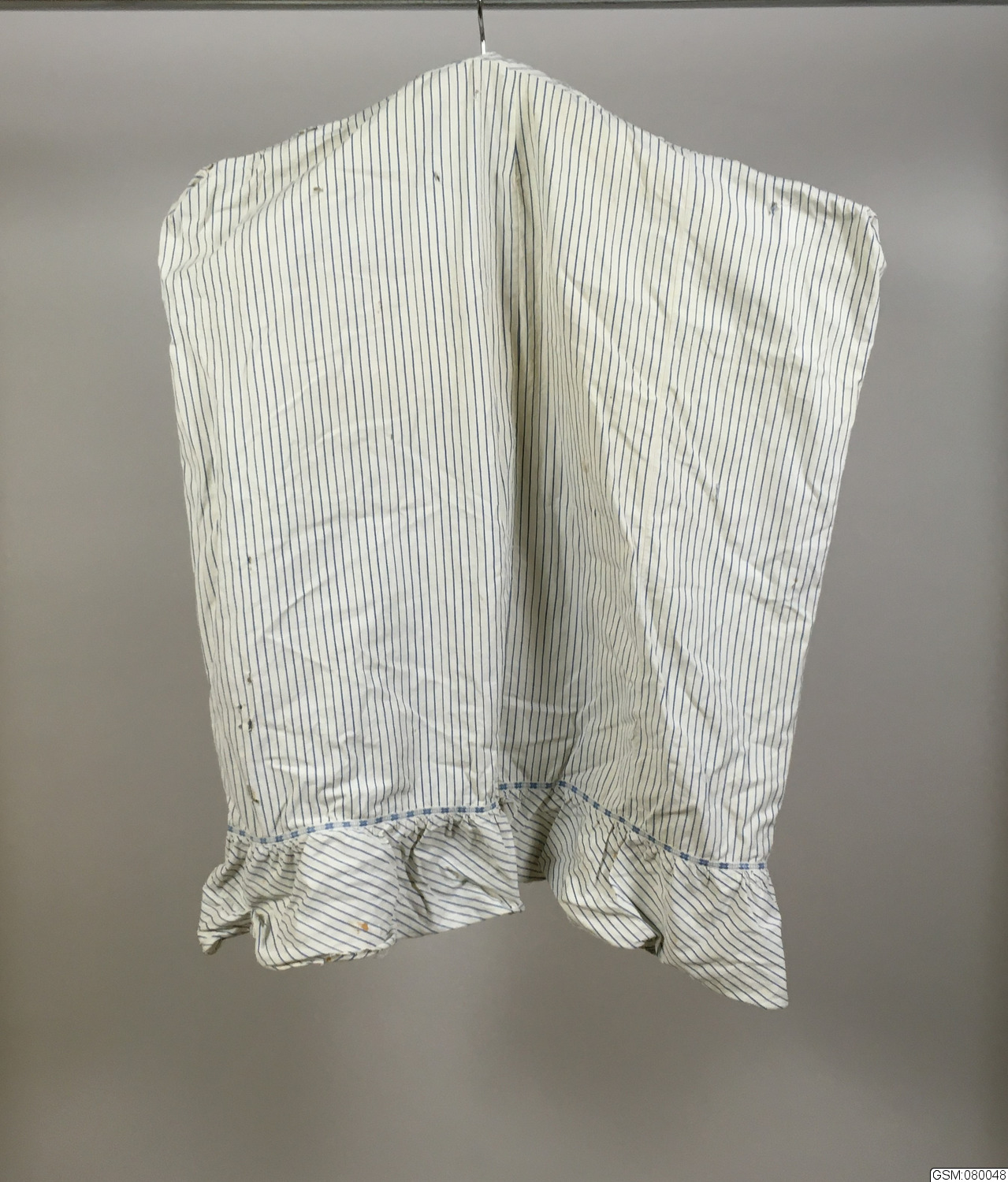 - klädpåse tillverkad av återbrukad bomullskjol eller möjligen två förkläden. Båda alternativen sannolikt från 1900-talets början. När det blev en klädpåse går inte att avgöra. Vit med glesa smala blå ränder. kjolkantens volang har behållts nedtill för att göra påsen så lång som möjligt, även hur kjolvåderna smalnar uppåt syns tydligt. Ett mönstervävt blått band med små stiliserade blå blommor är sytt på sömmen som syr fast volangen. Linningen ha klipts bort och en söm har istället sytts genom två lager tyg. En liten öppning är lämnad mitt på sömme för att trä galgens krok igenom.