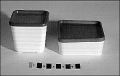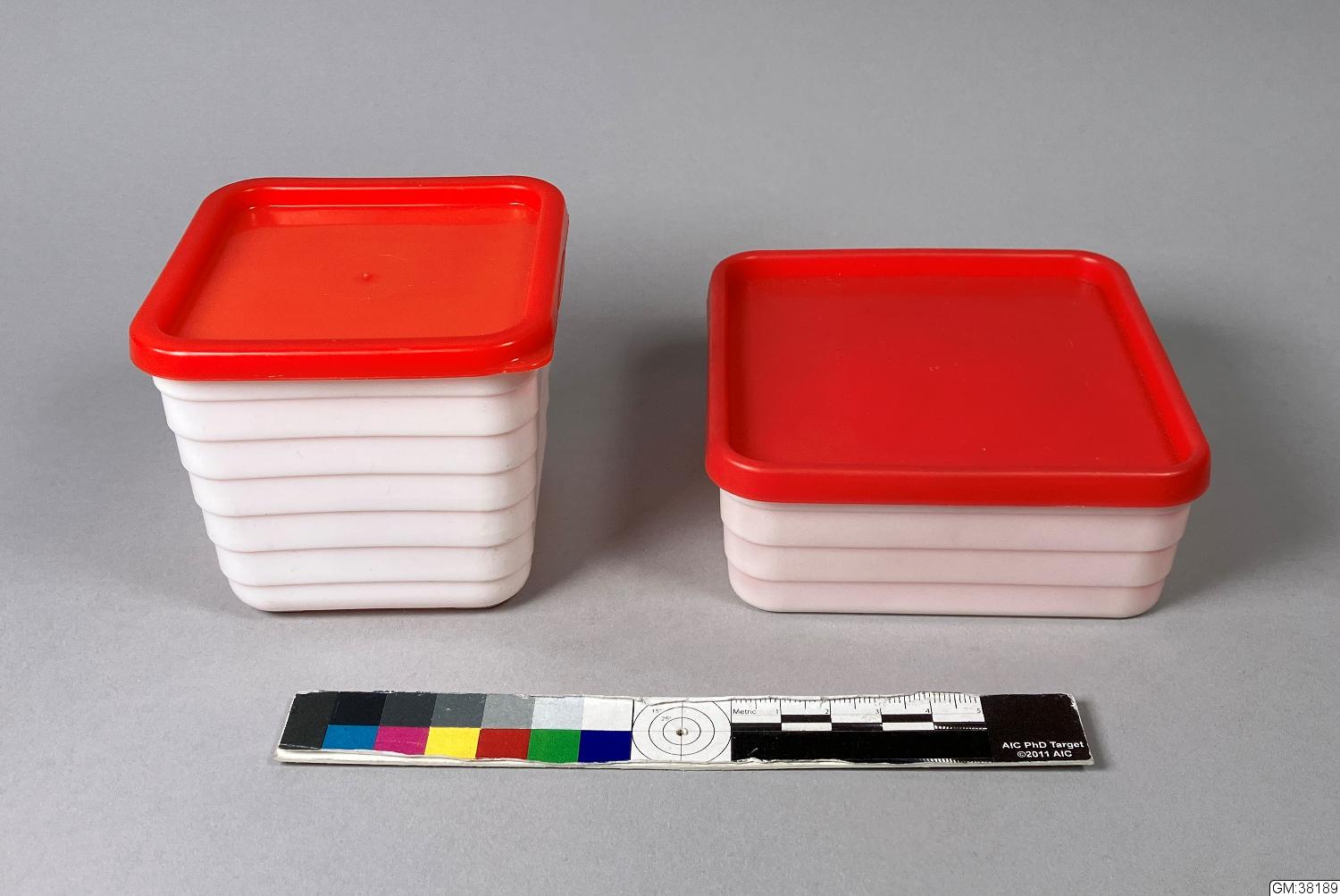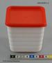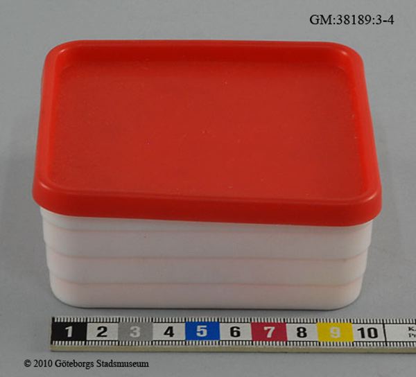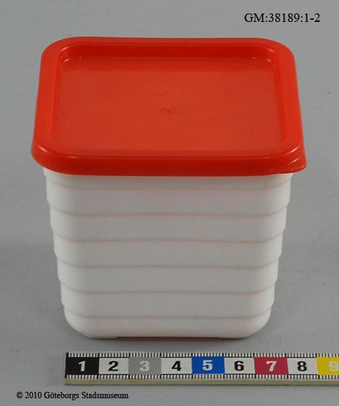 - Förvaringsburk för kylskåp av halvhård etenplast, burkarna är vita, fyrkantigamed horisontalrefflad utsida, locken är röda. Den burk som är högst är det tryckt "Hammarplast" i botten, måtten är 8X8X7,5 cm locket är 8,5X8,5 cm. Den burk som är lägst är 10X10X4,3 cm, locket är 10,3X10,3 cm.