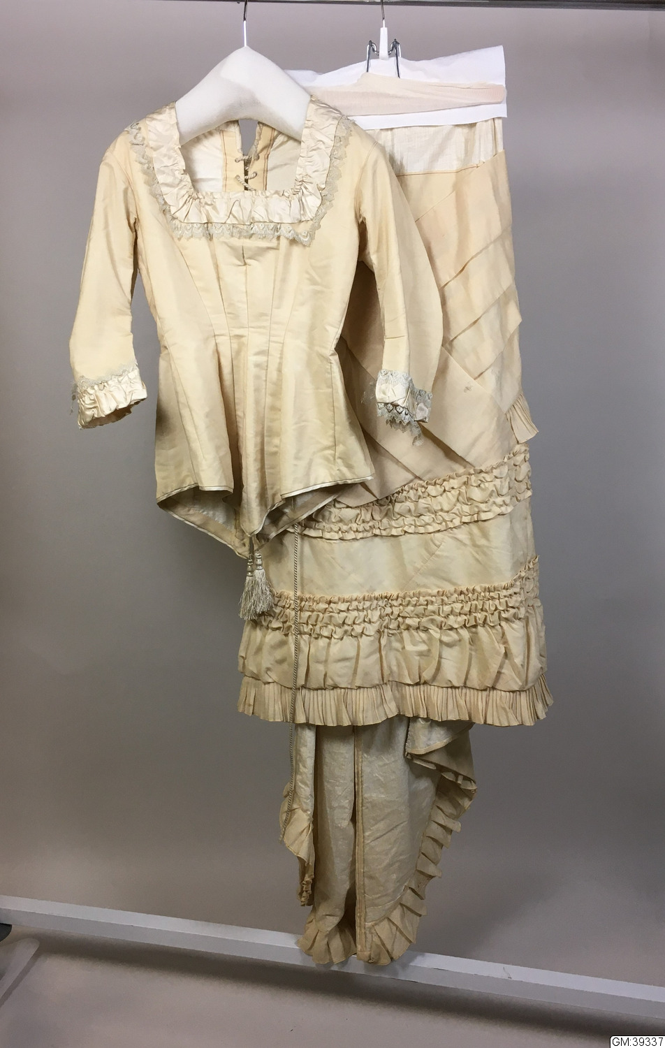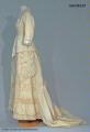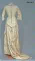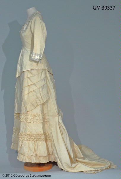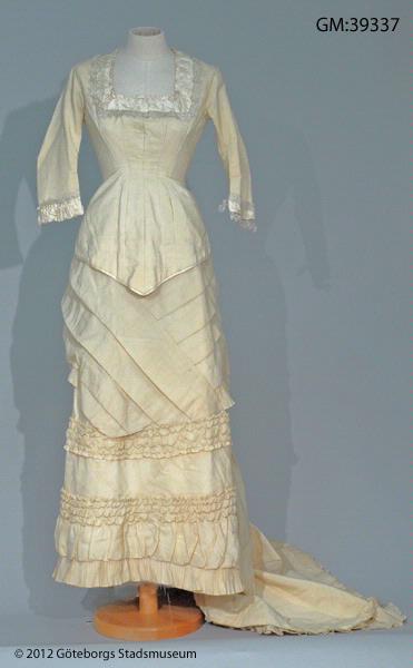 - Turnyrklänning av vit yllemuslin, klänningen är tvådelad: kjolen är sydd med diagonala raka veck fram samt ett assymetrisk draperat påsytt stycke över kjolens bakre våder. Livet går ned över höfterna och går ned i en snibb fram och bak. Midjan betonas starkt, ringningen är kantig och ärmarna trekvartslånga. Allt i överensstämmelse med senaste modet 1881. Tofsarna som avslutar bakstyckenas snibbar är sannolikt tänkta att ge illusionen av att vara avslutningen på den silkessnodd som snör samman livet i ryggen. Observera att fotot bakifrån visar en glipa i ryggen därför att dockan klänningen sitter på inte är lika smal som den korsetterade kvinna som bar klänningen, då hålen hela vägen bör ha varit i samma inbördes lodräta position som de två översta är på fotot.