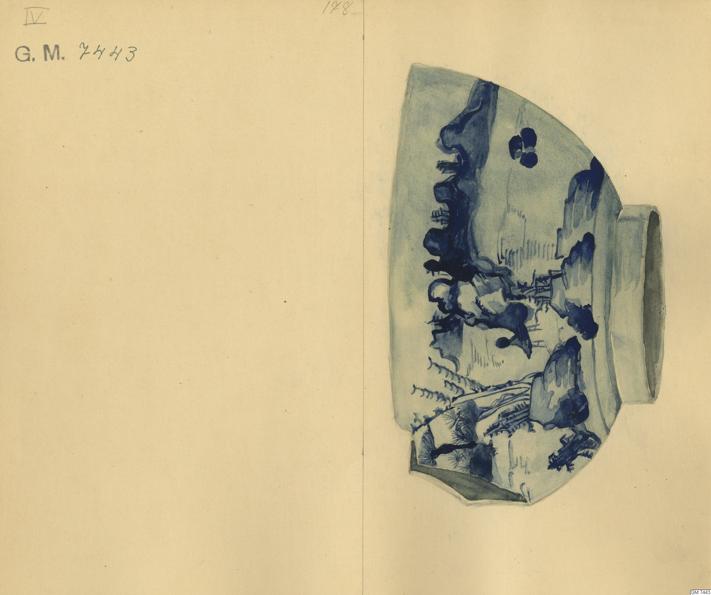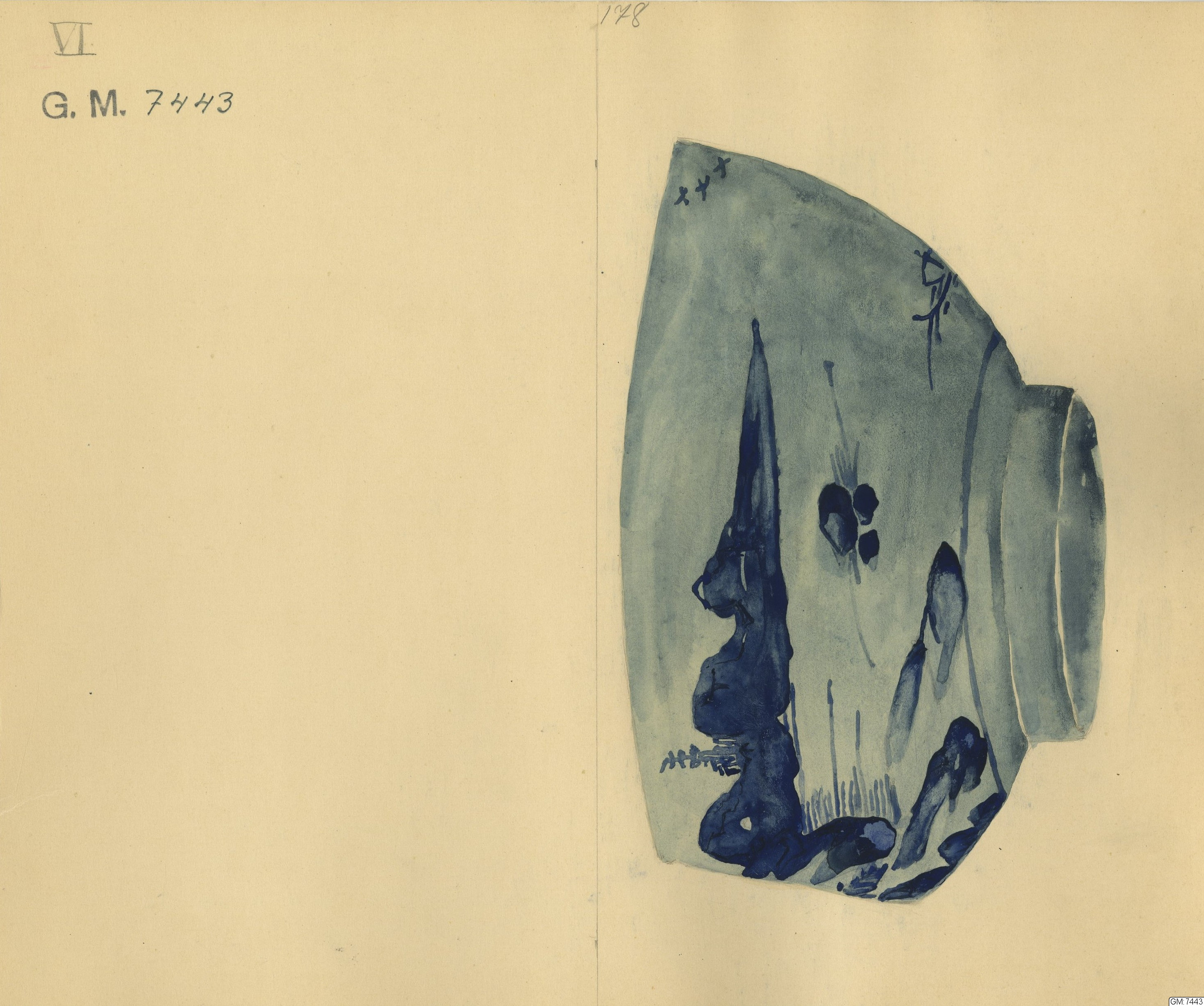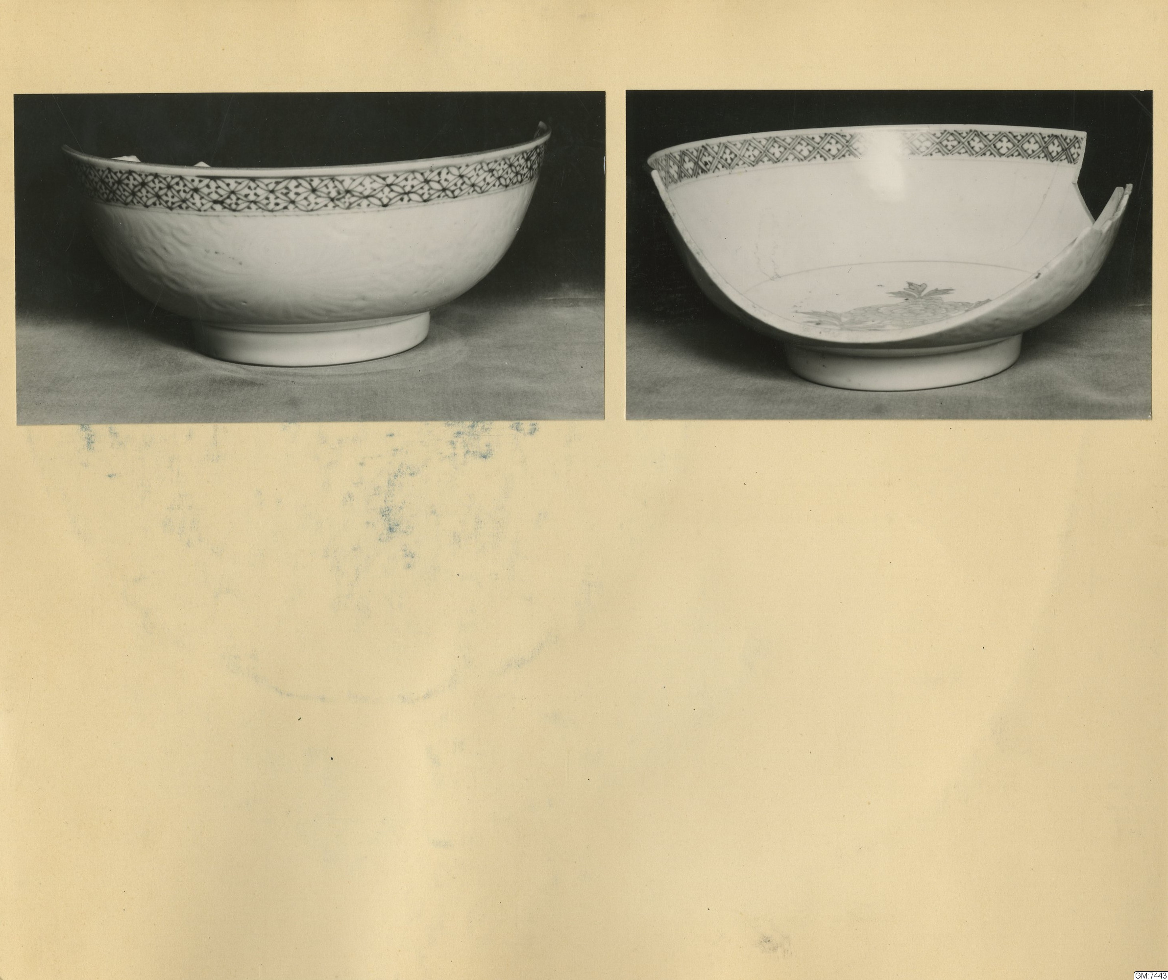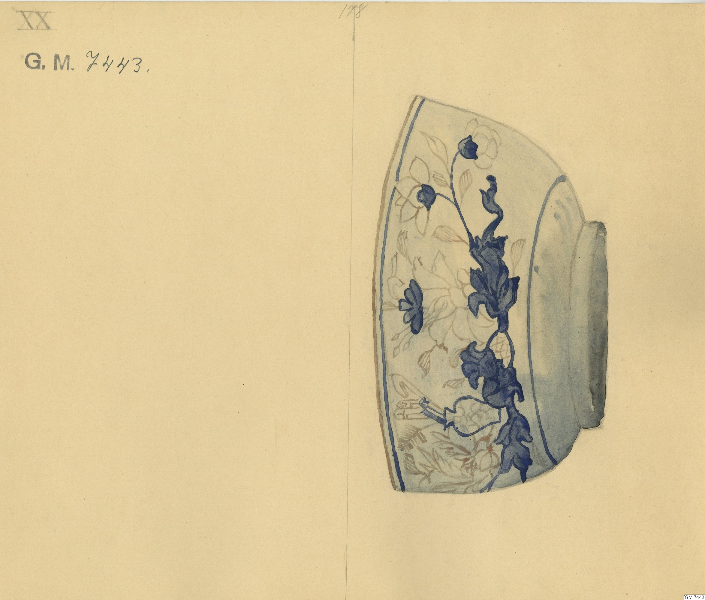 - 21 porslinsfragment från ostindiefararen "Götheborg". Ostindiskt porslin, för beskrivning se undernummer :1-88. 20 st av föremålen avritade i akvarell. Dessa föremål, liksom akvarellerna märkta I-XX. Den digitala bilden visar en uppställning av undernummer 1-87. Ej undernumrerade föremål är märkta endast 7443. Ett antal av föremålen utgöres av pärlmusselskal vilka aven de funnits ombord på båten, möjligtvis som sovernirer.