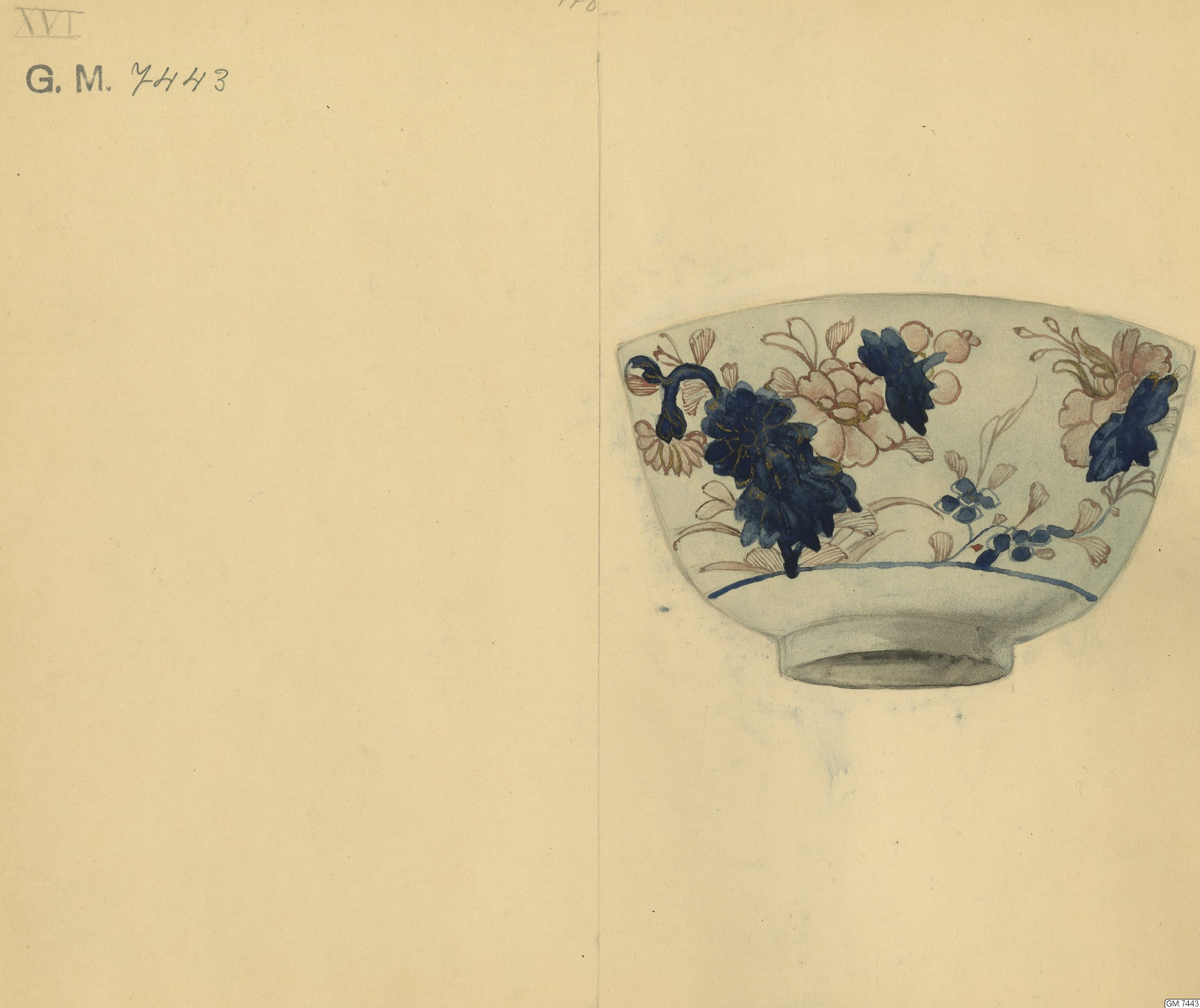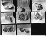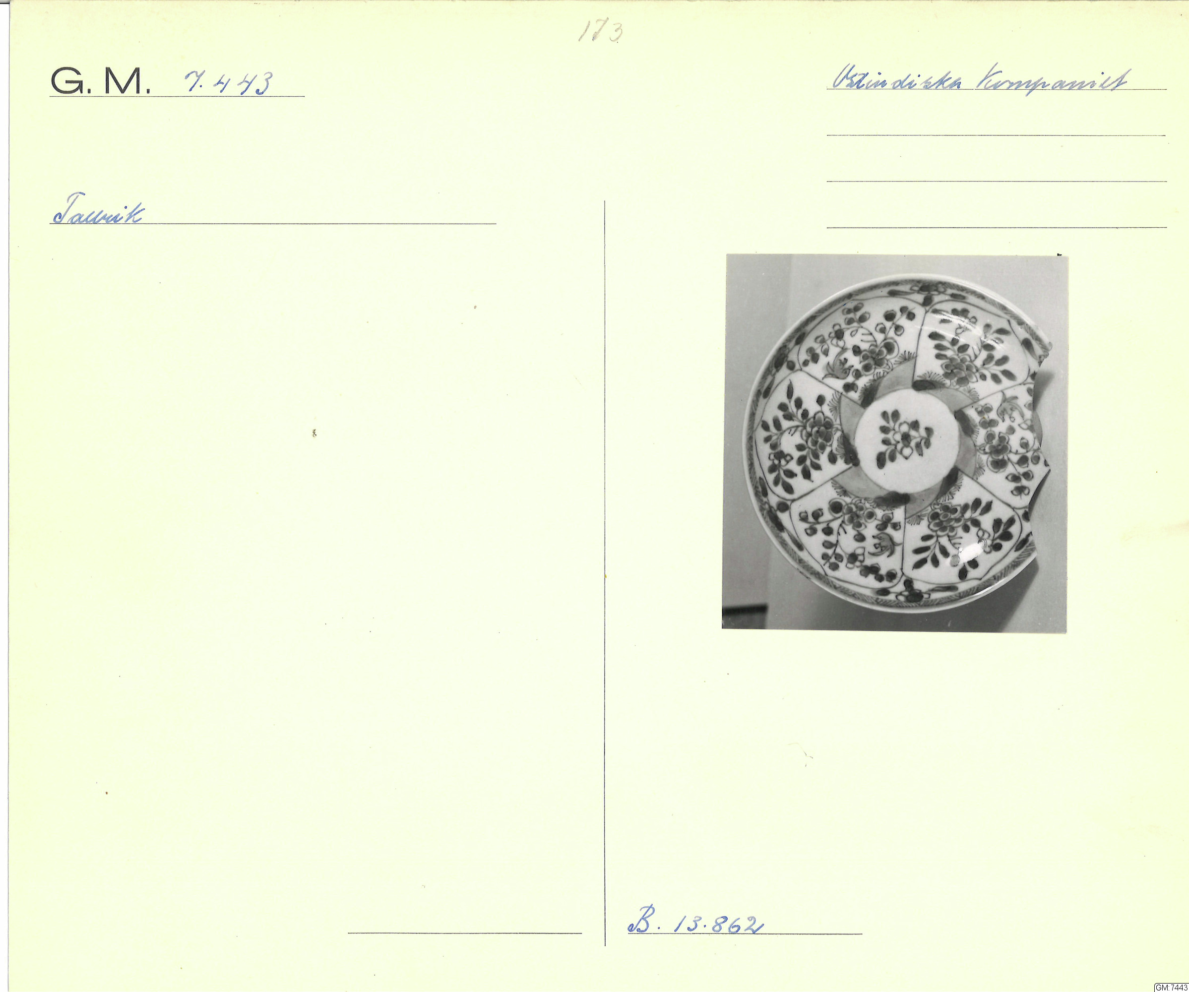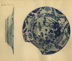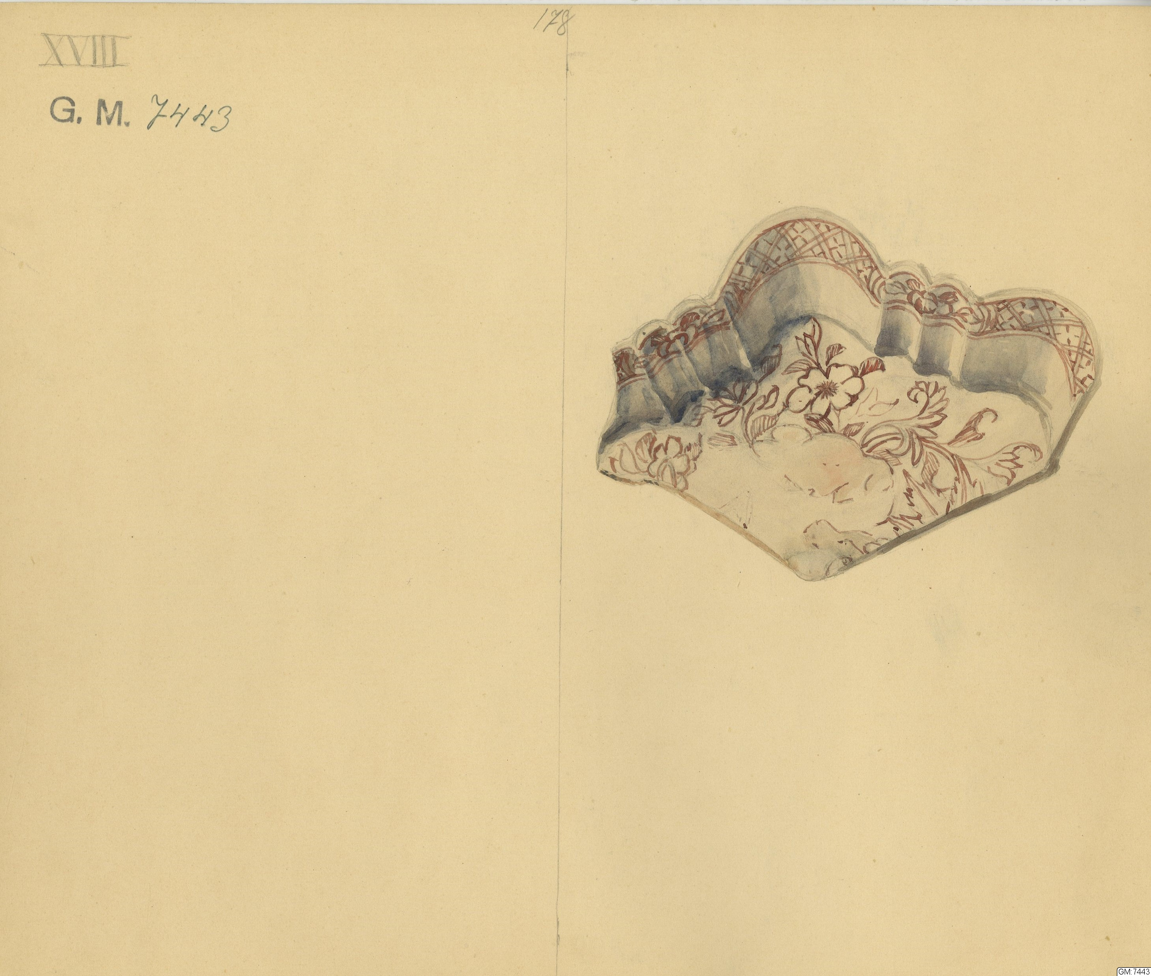- 21 porslinsfragment från ostindiefararen "Götheborg". Ostindiskt porslin, för beskrivning se undernummer :1-88. 20 st av föremålen avritade i akvarell. Dessa föremål, liksom akvarellerna märkta I-XX. Den digitala bilden visar en uppställning av undernummer 1-87. Ej undernumrerade föremål är märkta endast 7443. Ett antal av föremålen utgöres av pärlmusselskal vilka aven de funnits ombord på båten, möjligtvis som sovernirer.