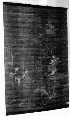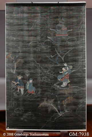 - Stråvävsjalusi. Små tunna ribbor hopvävda till jalusi. Svartmålad botten med figurer i kinesisk stil. Överst en stav med upphängningsanordning.