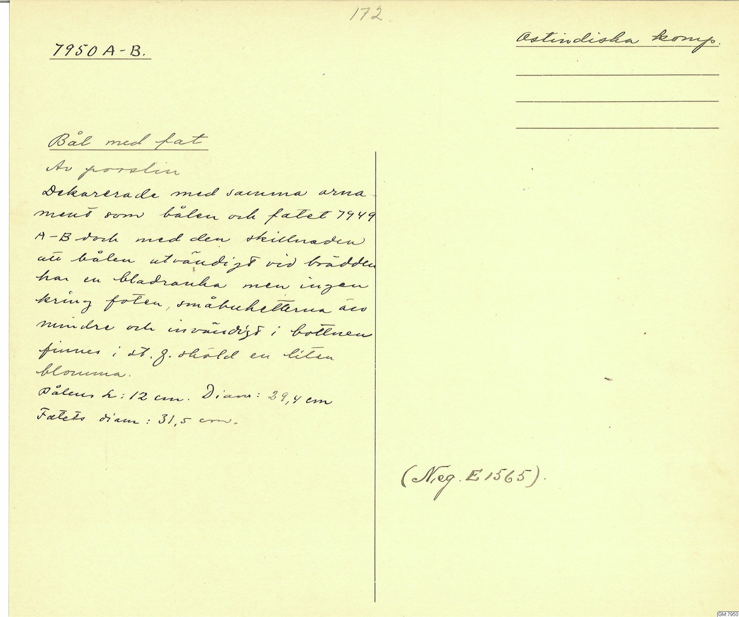 GM katalogkort 172. 18E. Porslin Ostindiskt 2. Fat, assietter, bålar
