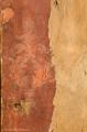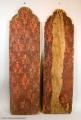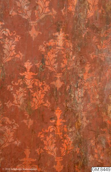 Baksidan har strukits med en tunn matt fuktkänslig brunröd färg (Caput Mortum) limfärg,under denna syns en tunn svart färg struken direkt på träytan.Dekor i form av schablonerat mönster i granatäppleform med bladornamentik.Färgen varierar i tjocklek har matt ytkaraktär och rödorange mönjeton.