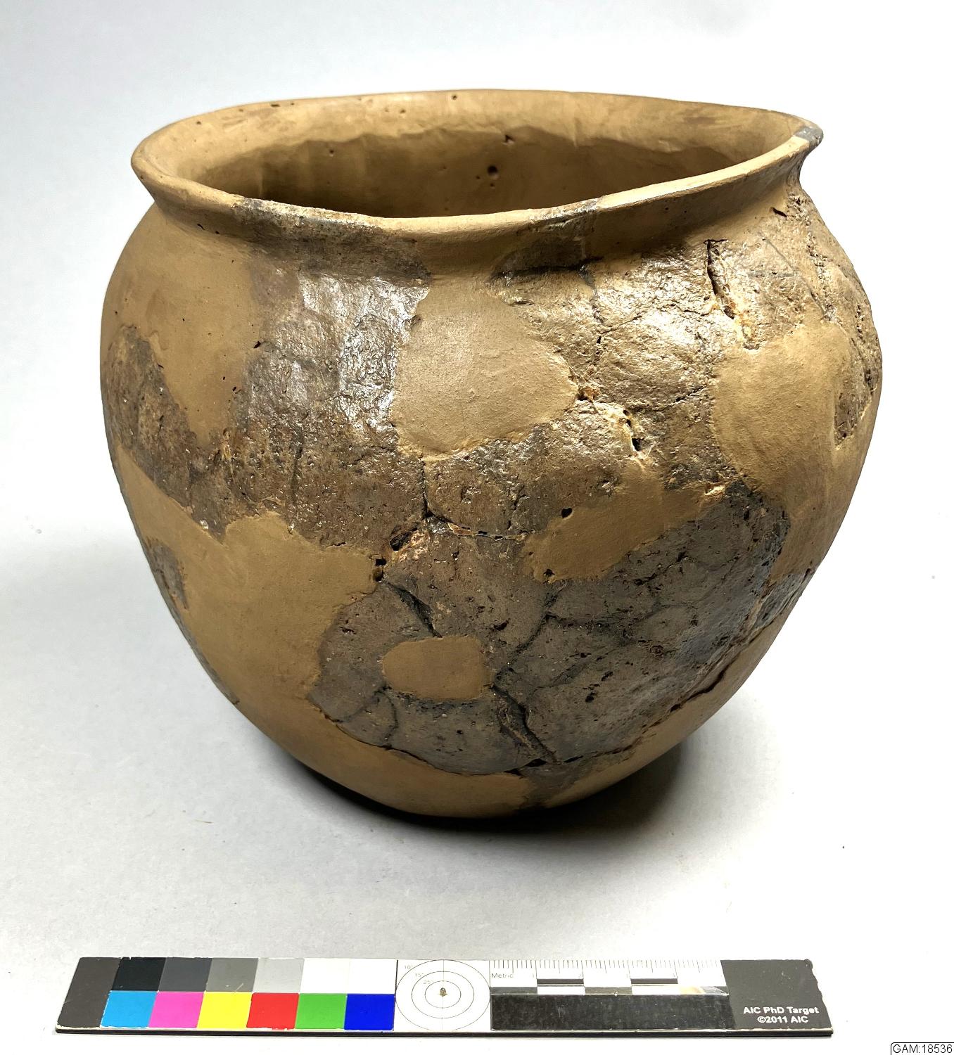 Keramikskärvan är hopsatt med GAM:18524-18536 till ett helt keramikkärl. Något restaurerat.