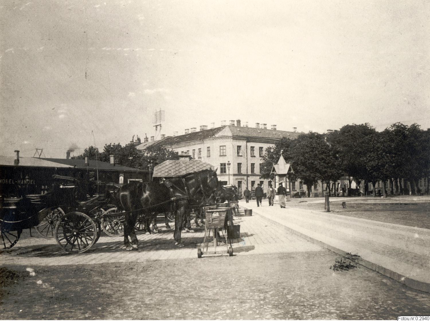 Järntorget mot norr med hörnhuset vid Järntorgsgatan och Norra Allégatan. Till vänster i bild droskstation med hästdroskor.