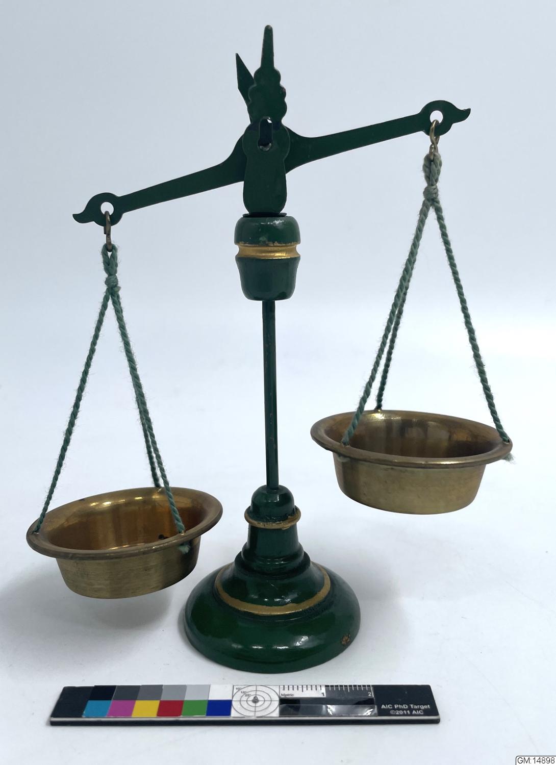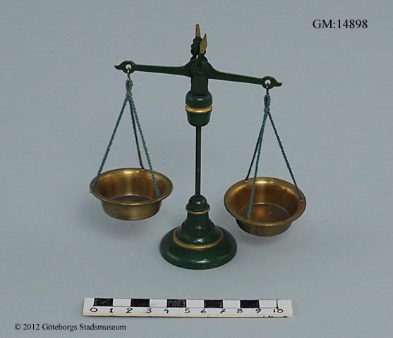 Leksaksvåg med stomme i trä och metall som är bemålat i grönt med detaljer i guld. Två stycken vågskålar i mässing som hänger i gröna snören.