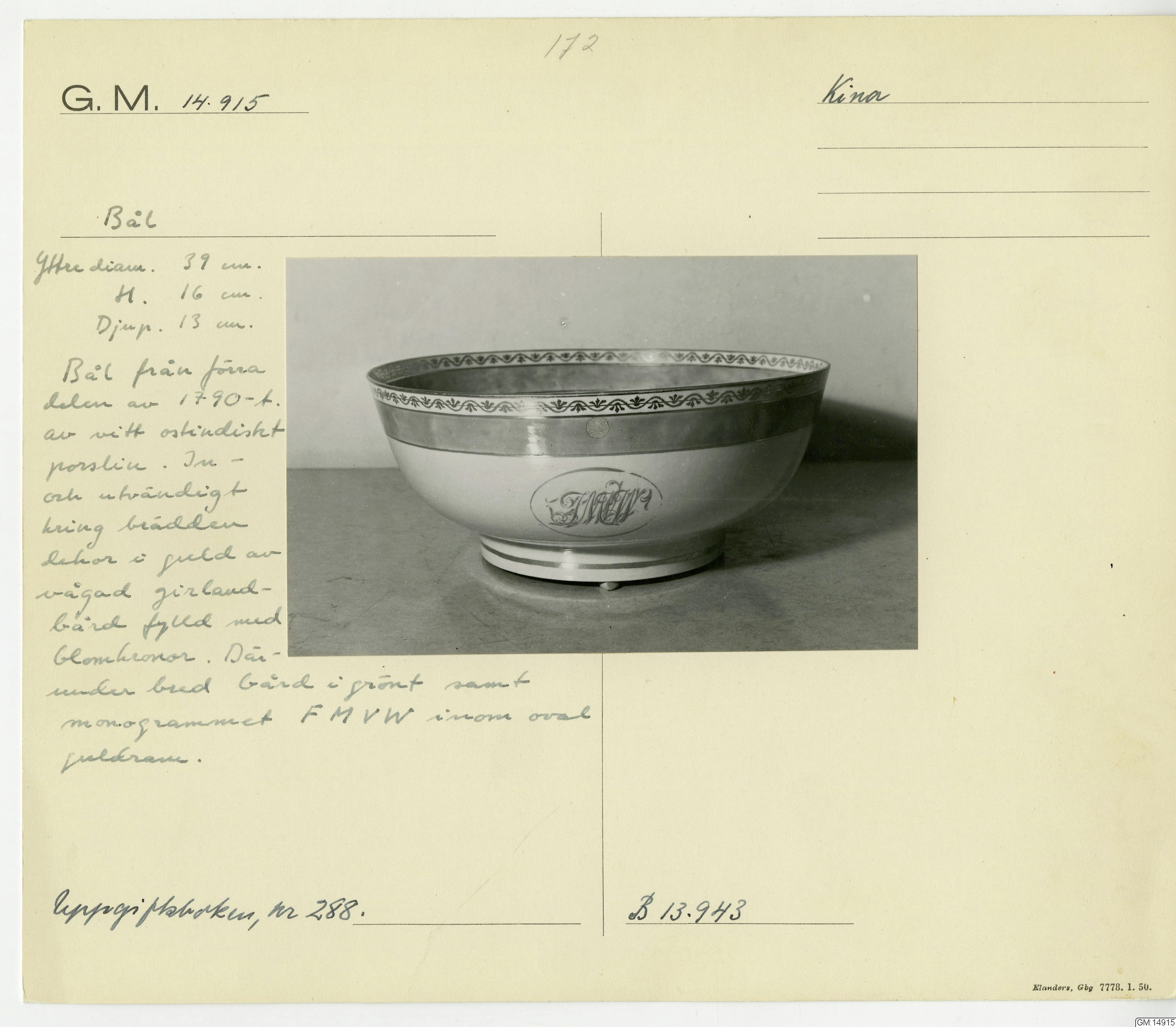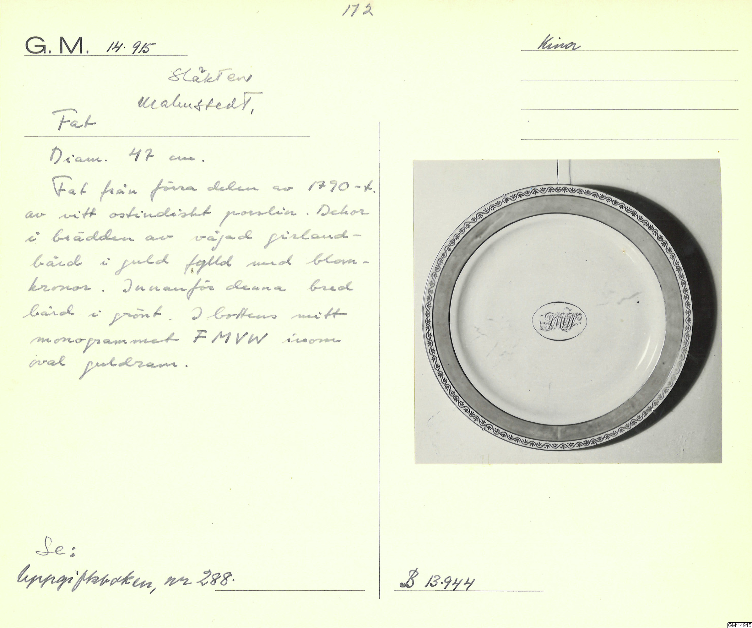 GM katalogkort 172. 18E. Porslin Ostindiskt 2. Fat, assietter, bålar
