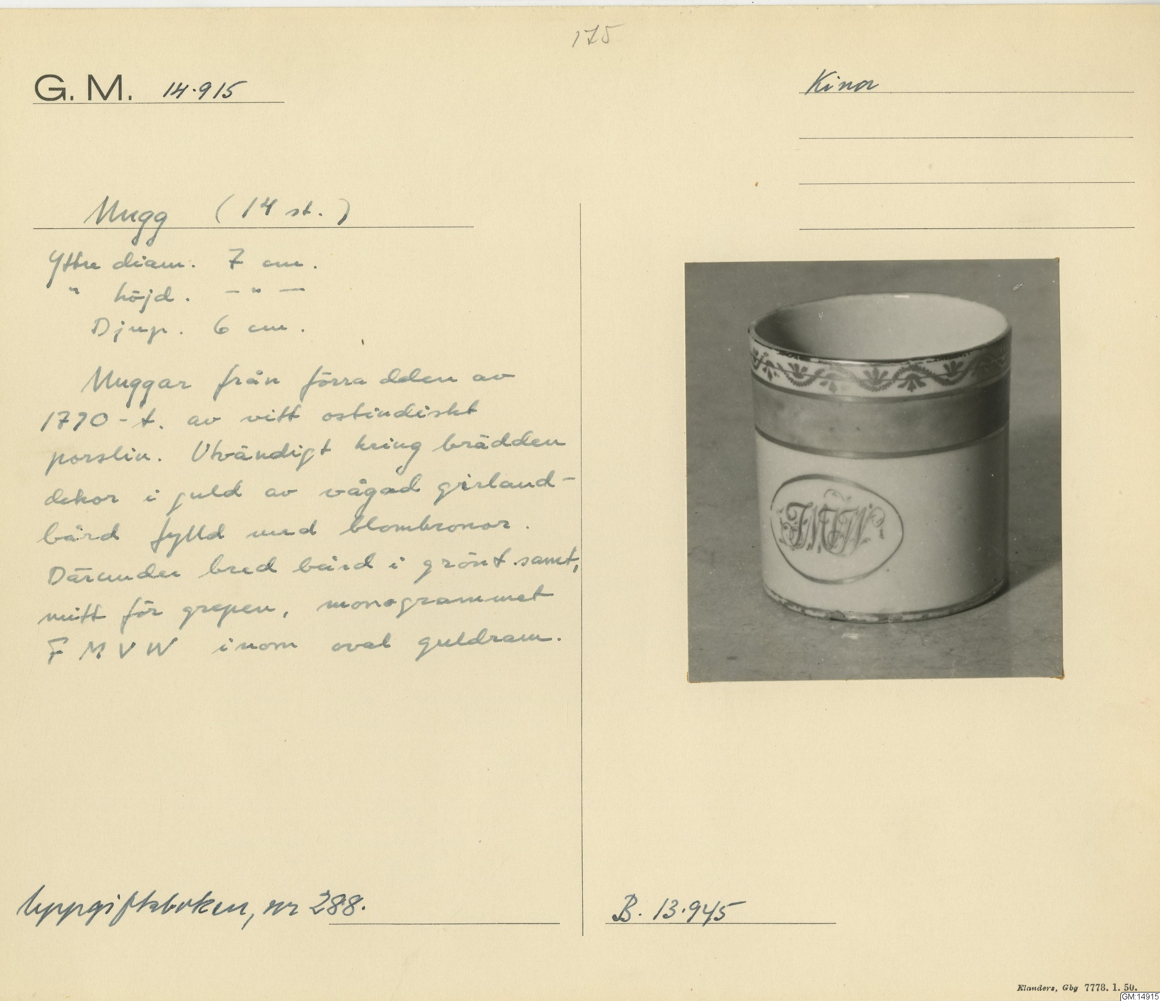 GM katalogkort 175. 18E Porslin Ostindiskt 5. Karott, terrin, muggar, skål mm
