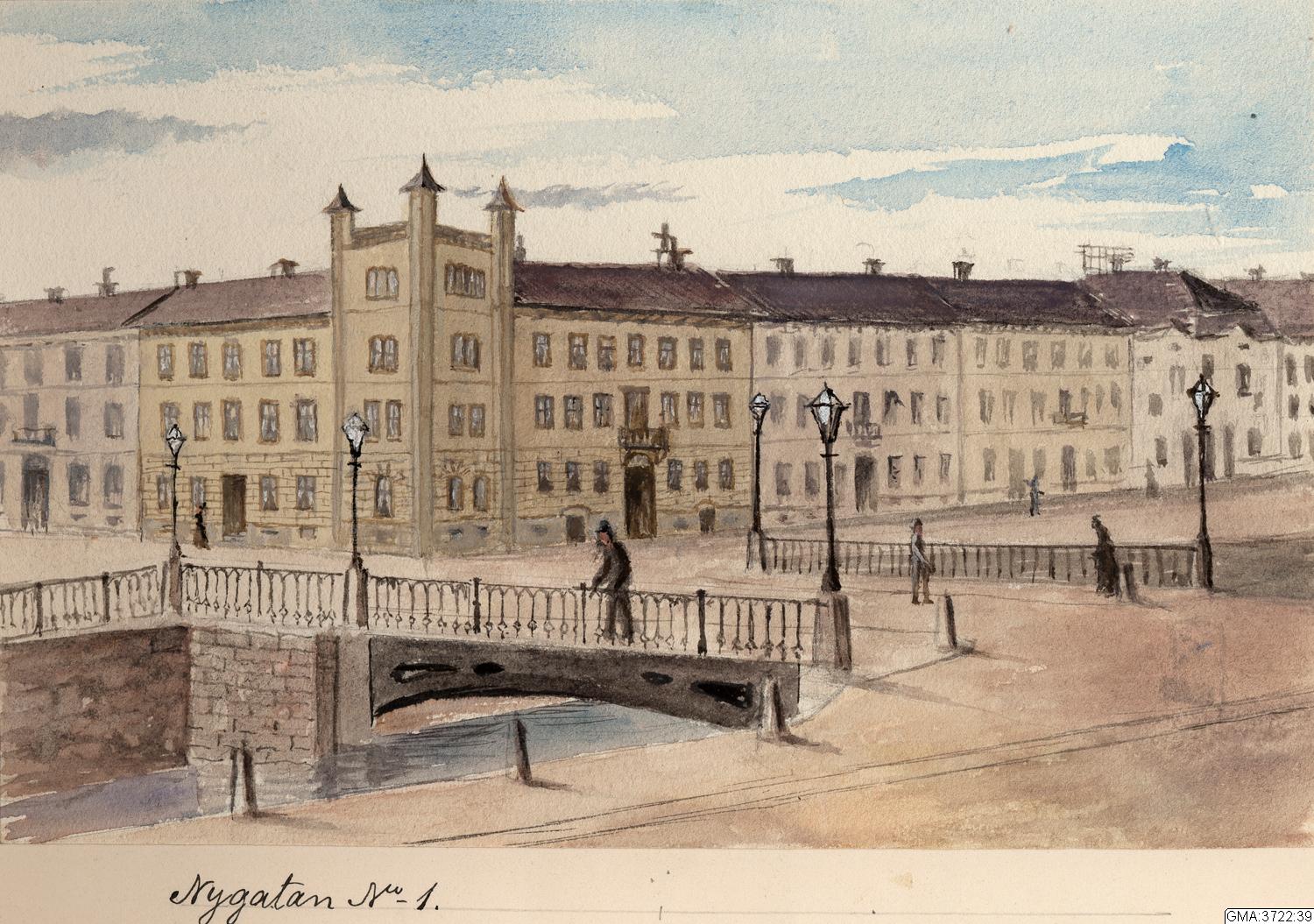 Stora Nygatan 1 sedd från Drottningtorget. Huset uppfört för grosshandlare E. L. Magnus 1853.