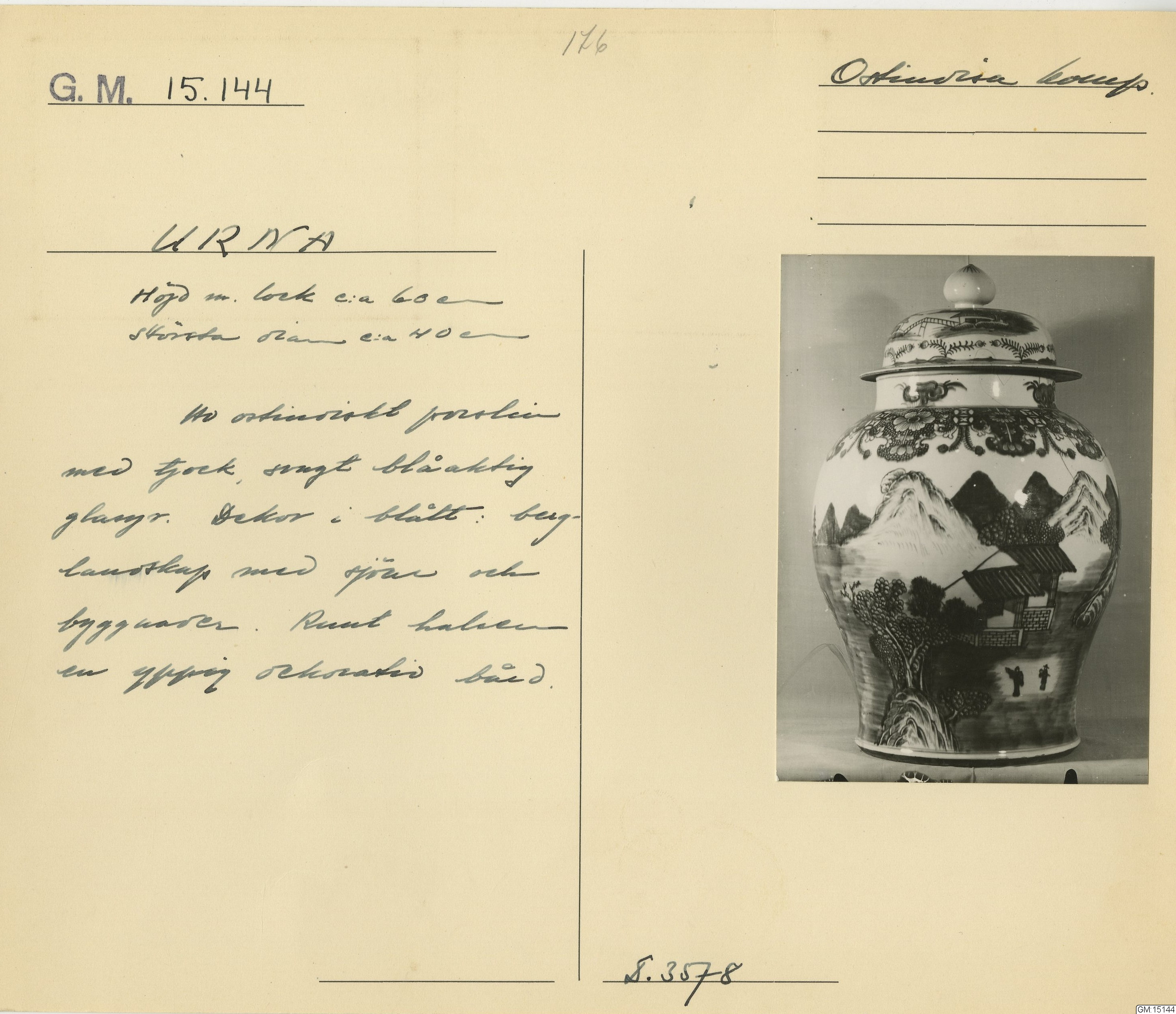 GM katalogkort 176. 18E Porslin Ostindiskt 6. Krukor, urnor, vaser, figuriner