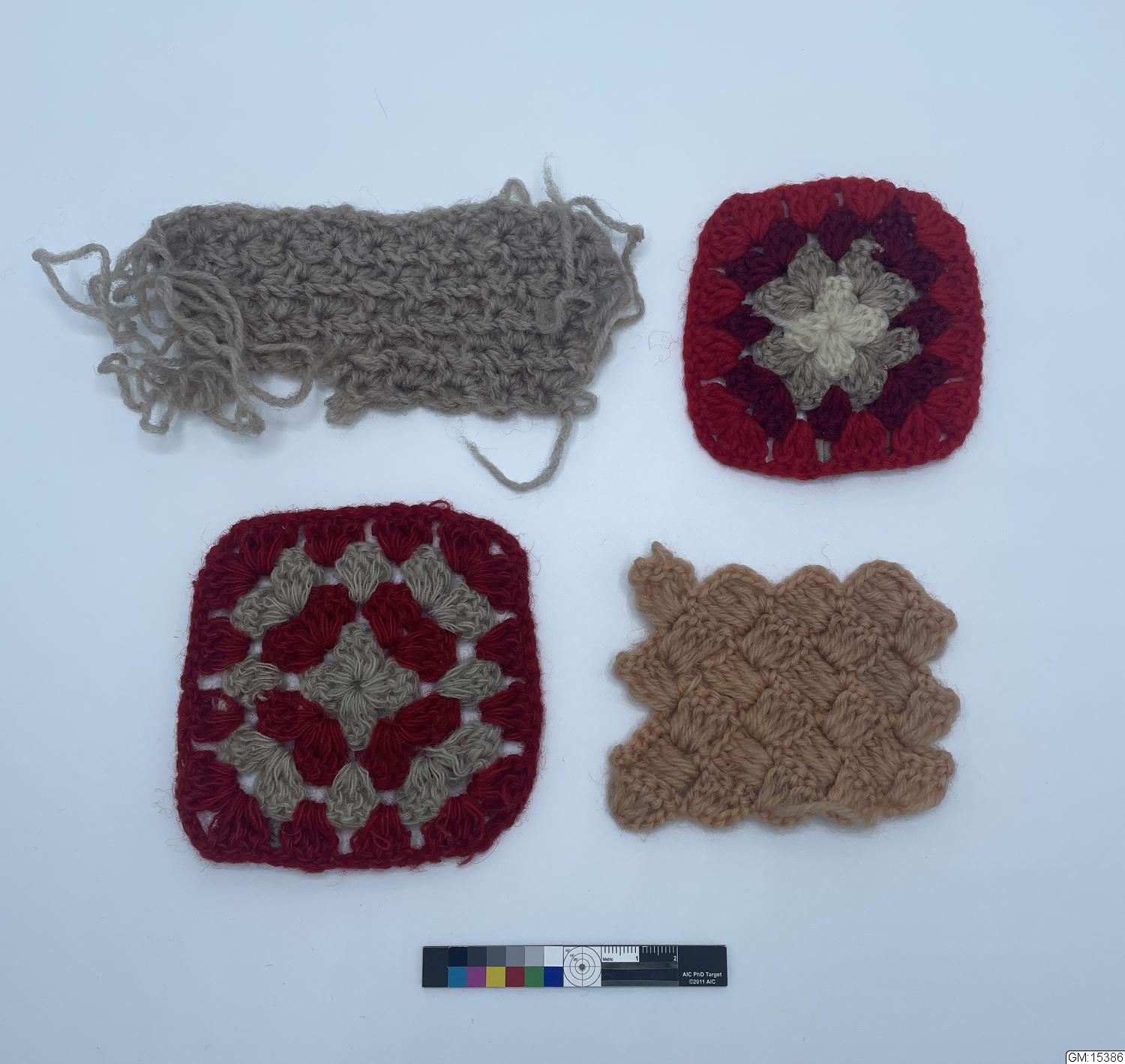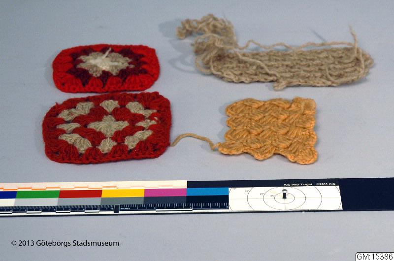 Prov på virkning i olikfärgat ullgarn de två "röda" proverna är så kallade mormorsrutor