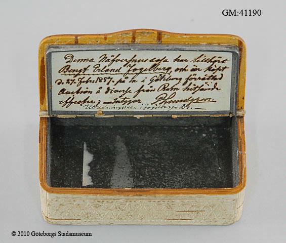 Denna näfversnusdosa har tillhört Bengt Erland Dahlgren, och är köpt d. 27 feb 1857, på en i Göteborg förättad Auktion å diverse från Rom hitförda effekter intygar P Lundgren. Utredningsman i Fogelbergs Bo. ; Denna näfversnusdosa har tillhört Bengt Erland Fogelberg, och är köpt d. 27 febr. 1857, på en i Göteborg förättad Auktion å diverse från Rom hitförda effecter intygar P Lundgren. Utredningsman i Fogelbergs Bo.