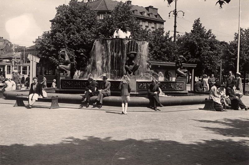 Folkliv runt Järntorgsbrunnen. Vy från väster.