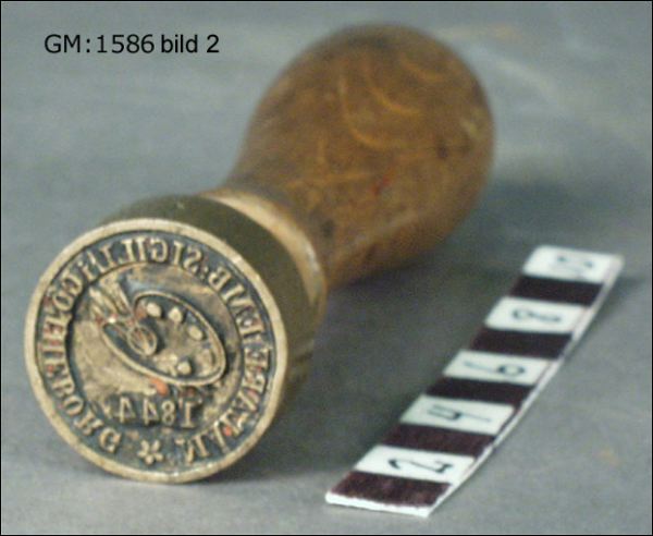 "Sigillstamp, 1844. Målare-ämbetet i Göteborg. Av mässing och trä. Svarat skaft. Cirkelrund sigillplatta. I dess mitt en palett med färger och penslar samt därunder årtalet 1844. Rundskrift och utanför denna bred, flat rand: MÅLARE EMB:SIGILL I GÖTHEBORG.