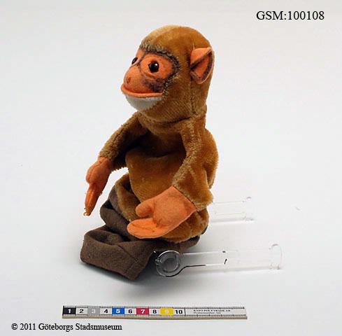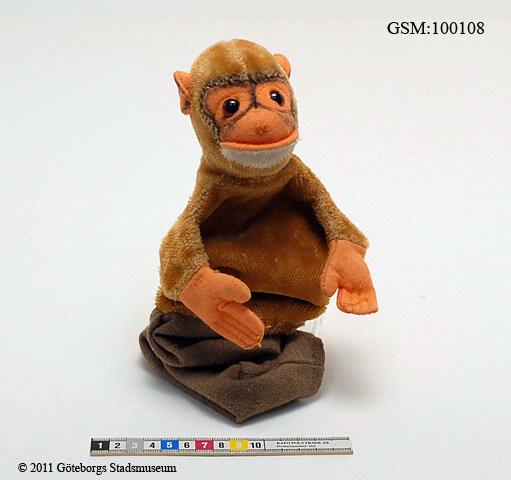 - kasperdocka i form av apa.den ärsannolik tillverkad av den tyska leksaksfirman Steiff som särskilt under 1970 talet även producerade kasperdockor. En apgdocka med snarlikt utseende,(annan brun färg på pälsen och blekare filt i ansikte öron och händer) finns på en nätsida om företaget Steiff under 1970 talet .en undersida till företagets hemsida. (mars 2011 gan)