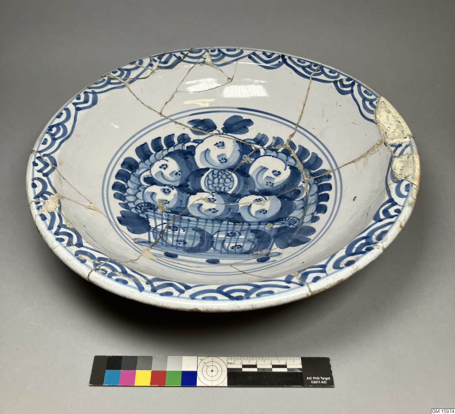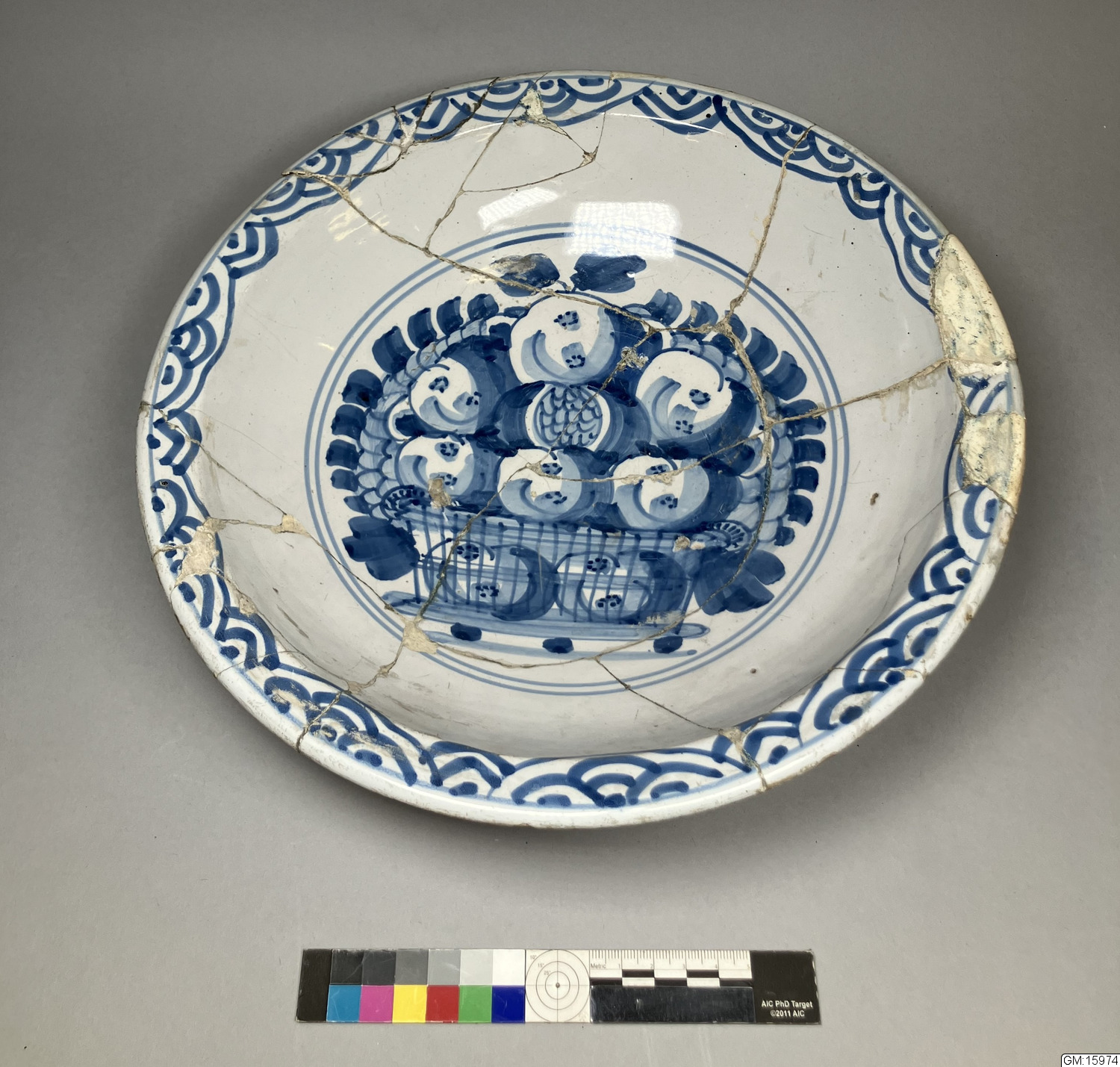 Skål av holländsk fajans med fruktmotiv i nationell stil och kinesisk bård i blått.