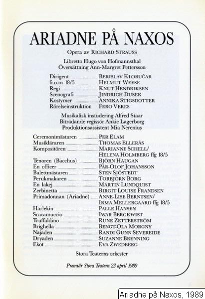 Bergkwist, Iwar; Berntsen, Anne-Lise; Borg, Torbjörn; Brenning, Suzanne; Elam, Per; Ellerås, Thomas; Hansen, Palle; Haugan, Björn; Holmberg, Helena, sångare; Johansson, Per-Olof; Lundquist, Martin; Mellergaard, Irma; Morgny, Bengt-Ola; Schell, Marianne; Severeide, Randi Gunn; Sjöstedt, Sten; Stora Teaterns orkester; Zetterström, Rune; Zwedberg, Eva