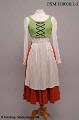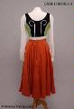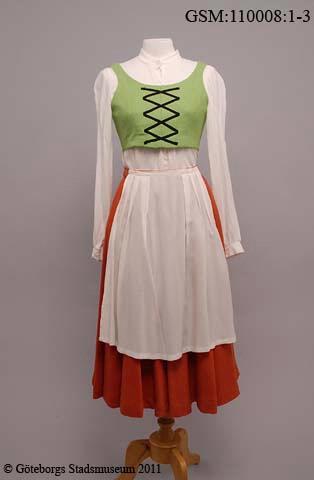 2: Kjol i ljusröd yllecrepe med stor vidd och klockad skärning. Knäppning med hyskor/hakar och tryckknappar mitt bak. Isydd underkjol i vit tyll. Förkläde i vit viscose fastsytt i kjolens linning med lagda veck. Längd kjol: 78 cm, vidd nedtill: 545 cm, längd förkläde: 55 cm.