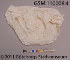 4: Vita underbyxor i bomull med två rader påsydda volanger fram och bak samt rynkning mot benen. Resår i midjan.