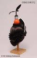 Peruken är prydd med ett diadem i svart och vit tyg. Mitt på huvudet står ett torn med ett rött klot med en svart hög prydnad på prydd av svarta blad i tyg. Peruken har även prydnader av svarta tofsband. I nacken sitter ett brunt resår. I nacken sitter en företagslapp med "elura, blend, modacrylic fiber, USA & Japan"