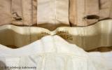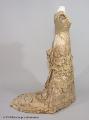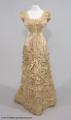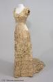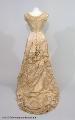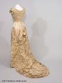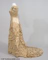 Klänning av gulvitt siden. Livet åtsittande, sytt av 12 stycken, knäppes i ryggen med knappar och knapphål. Knapparna överklädda med sidenet. Djup, rund urringning. Ärm: en smal remsa av tyget, som uppe vid axeln rundats av och går något om lott. Kring halsringningen och ärmhålen vit silkesspets; knytes ihop med en genomdragen snodd. foder: vit bomullskypert med 4 insydda fjädrar. Midjeband halvsiden med firmanamn: " Mode Magasin Henr. Ahlberg Göteborg". Kjolen fäst vid livet. Foderkjol av vitt bomullstyg samt delsvis förstärkt med gas. Tunik rynkad fram draperad samt veckad vid bakvåden. Därunder en veckad våd bredast fram samt två rynkade våder. Alla dessa avslutade med en eller två rader silkesspets. Nederst tre smala veckade volanger. Bakvåden är veckad i sömmarna och bildar turnyr samt övergår i ett rundat släp som kantas av en plisserad våd samt därinnanför en volang med dubbla motveck. Foderkjolen rikt rynkad bak och sammanhållen av 3 rader knytband. Nedtill en plisserad volang av tunn gas kantad med spets (nu till största delen borta). Under släået dessutom 2 plisserade våder av stadigare gas. Buren på amarantherbal vintern 1879-80.