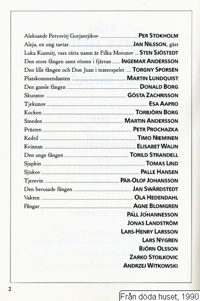 Aapro, Esa; Andersson, Ingemar, operasångare; Andersson, Martin, operasångare; Blomgren, Agne; Borg, Donald; Borg, Torbjörn; Hansen, Palle; Hedendahl, Ola; Jóhannesson, Páll; Johansson, Pär-Olof; Landström, Jonas; Larsson, Lars-Henry; Lind, Tomas; Lundquist, Martin; Nieminen, Timo; Nilsson, Jan, skådespelare; Nygren, Lars; Olsson, Björn, operasångare; Prochazka, Petr; Sjöstedt, Sten; Sporsén, Torgny; Stoilkovic, Zarko; Stokholm, Per; Stora Teaterns orkester; Strandell, Torild; Swärdstedt, Jan; Walin, Elisabet; Witkowski, Andrzej; Zachrisson, Gösta