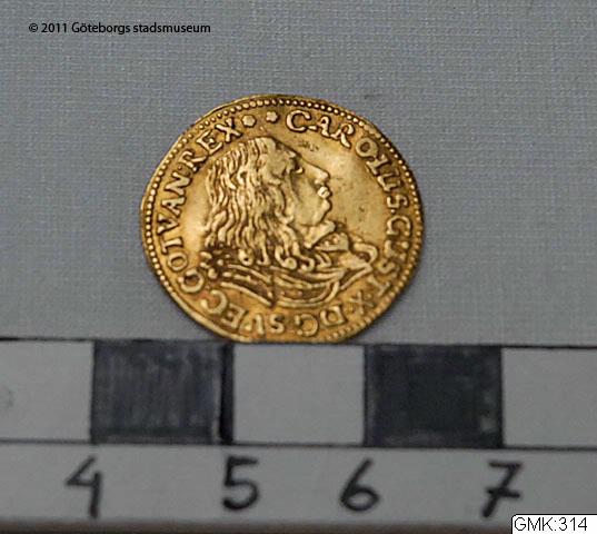 Dukat, guld, slagen i Stockholm 1658 för Carl X Gustaf.