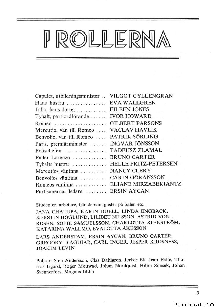Capulet; utbildningsminsister; Capulets hustru; Julia; Tybalt; partiordförande; Romeo; Mercutio; Benvolio; Paris; premiärminister; polischefen; fader Lorenzo; Tybalts hustru; Mercutios väninna; Benvolios väninna; Romeos väninna; partisanernas ledare; student; arbetetare; tjänsteman; gäst på balen; polis