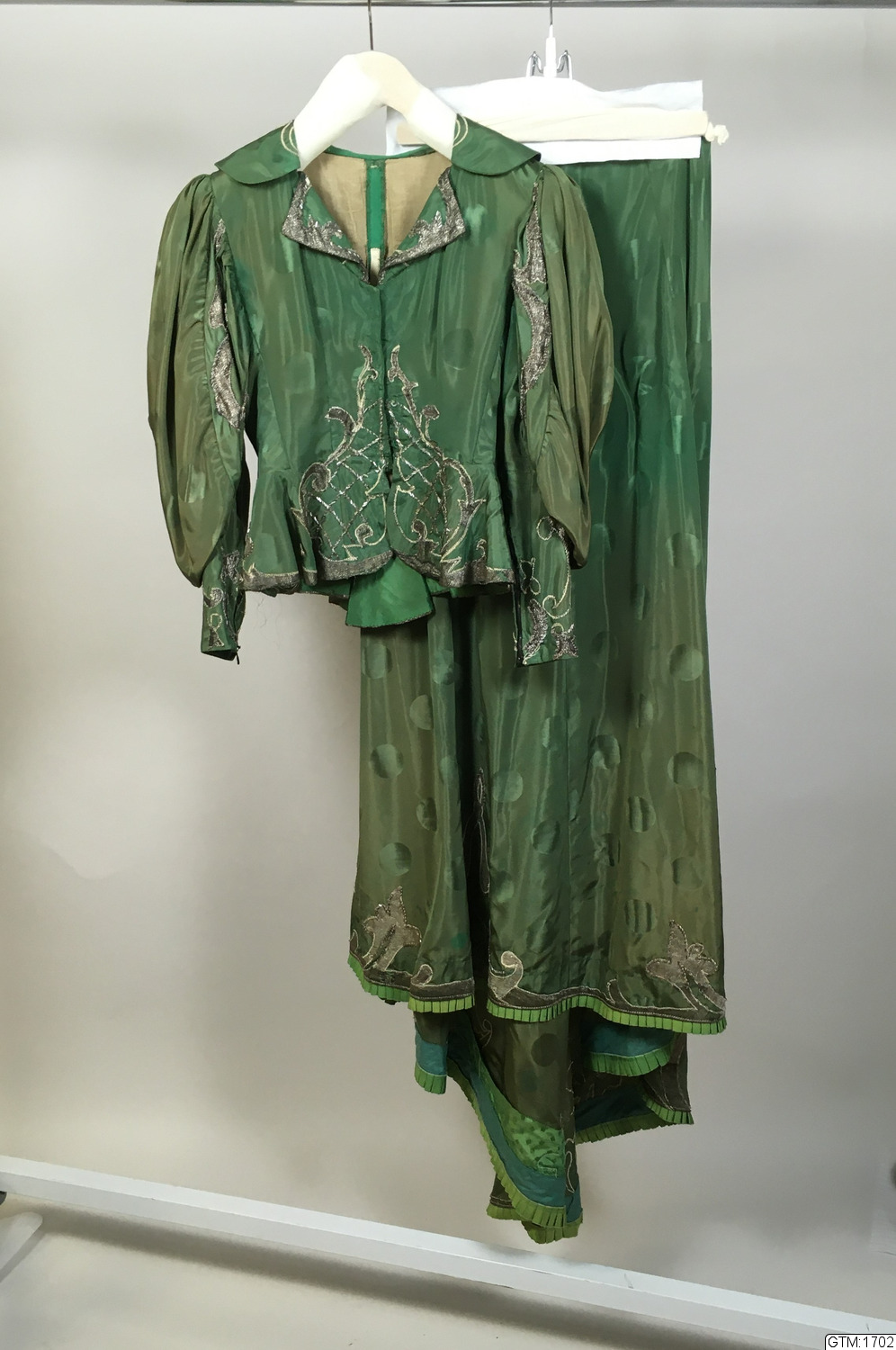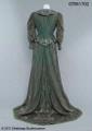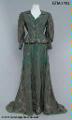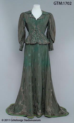Klänning i grön mönstrad taft 147 cm lång med släp 45 cm långt. Klänningen består av kjol och jacka, dekorerade med applikationsbroderi av silverlamé och pärlor.