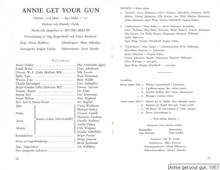 Bohm, Berith [Annie Oakley]; Chkalikoff, Nicolas; Elam, Per [Tommy Keeler]; Forsberg, Marianne [Nellie]; Forsén, Birger [konduktör]; Gabay, Eugène; Gabay, Michael [Jake]; Gabay, Nadja [Jessie]; Gårdfeldt, Gunilla [Minnie]; Hallén, Berit [Winnie Tate]; Heilman, Gunilla [(trol) Jessie]; Höglund, Paul [Foster Wilson]; Jakobsson, Claes [Frank Butler]; Johansson, Gunnel, skådespelare; Jonason, Bengt [sovvagnsbetjäning]; Kieratz, Ulla; Kuhlberg, Leo [Mac, sjungande indian]; Larson, Olle [W F Cody]; Larsson, Gunnar, sångare [Major Gordon Lillie]; Lindström, Maj [Annie Oakley]; Lundell, Yvonne [(trol.) Nellie]; Magnusson, Birgitta; Norrlén, Severin [Foster Wilson]; Pettersson, Elsie-Marie; Roberts, Shirley; Rogård, Siv [Sylvia Potter-Porter]; Sprimond, Bertil [sovvagnsbetjäning]; Spångberg, Curt [Charlie Davenport]; Söderman, Eivor; Wald, Ina; Wallenius, Toivo [Jake]; Wallman, Lillwi; Weng, Egon; Willander, Margreth; Winquist, Ulla [Minnie]; Zetterman, Eric [Sitting Bull]; Zetterman, Rosa [Dolly Tate]