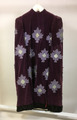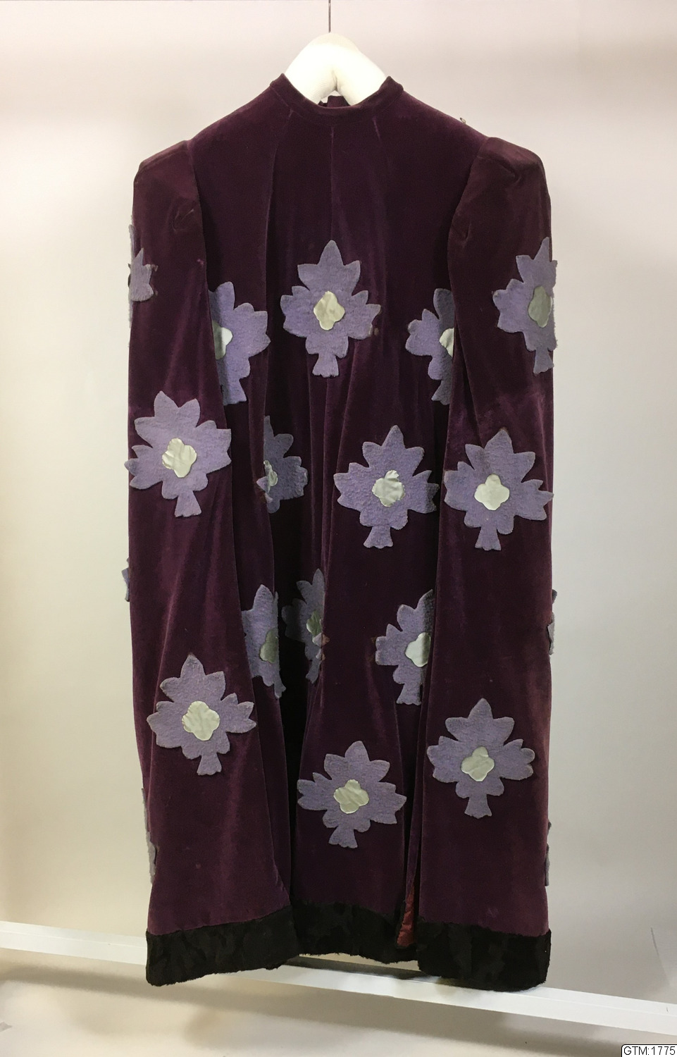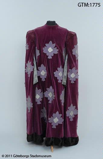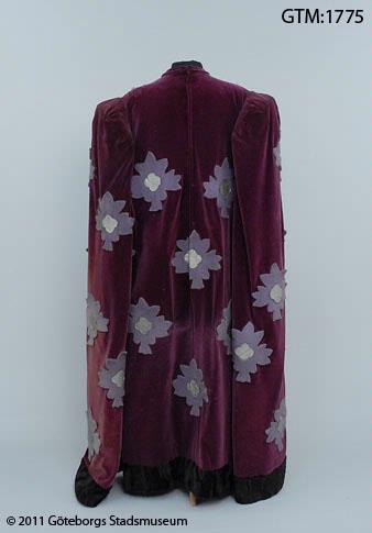 "Dräkt i purpurfärgad sammet 146 cm lång, med dekorationer av blålila filt påklistrade. På dekorationerna är en bit silverfärgad konstläder dels påklistrad dels sydd.