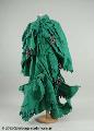 Det gröna tyget som dräkten består av verkar bestå av två ihoplimmade lager tyg. De silversprayade kottarna är fastsydda upptill på olika ställen på dräkten. Hatten ej inventerad. /lzg 2012-11-02
