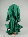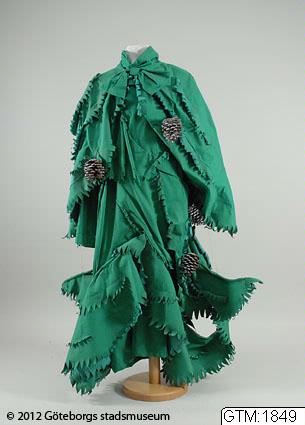 "Dräkt av grön markisväv, 140 cm lång. Dräkten är utformad som en julgran med grenar, kottar och tillhörande hatt med fågelbo och toppstjärna." /ur katalogkort lzg 2011-10-25