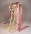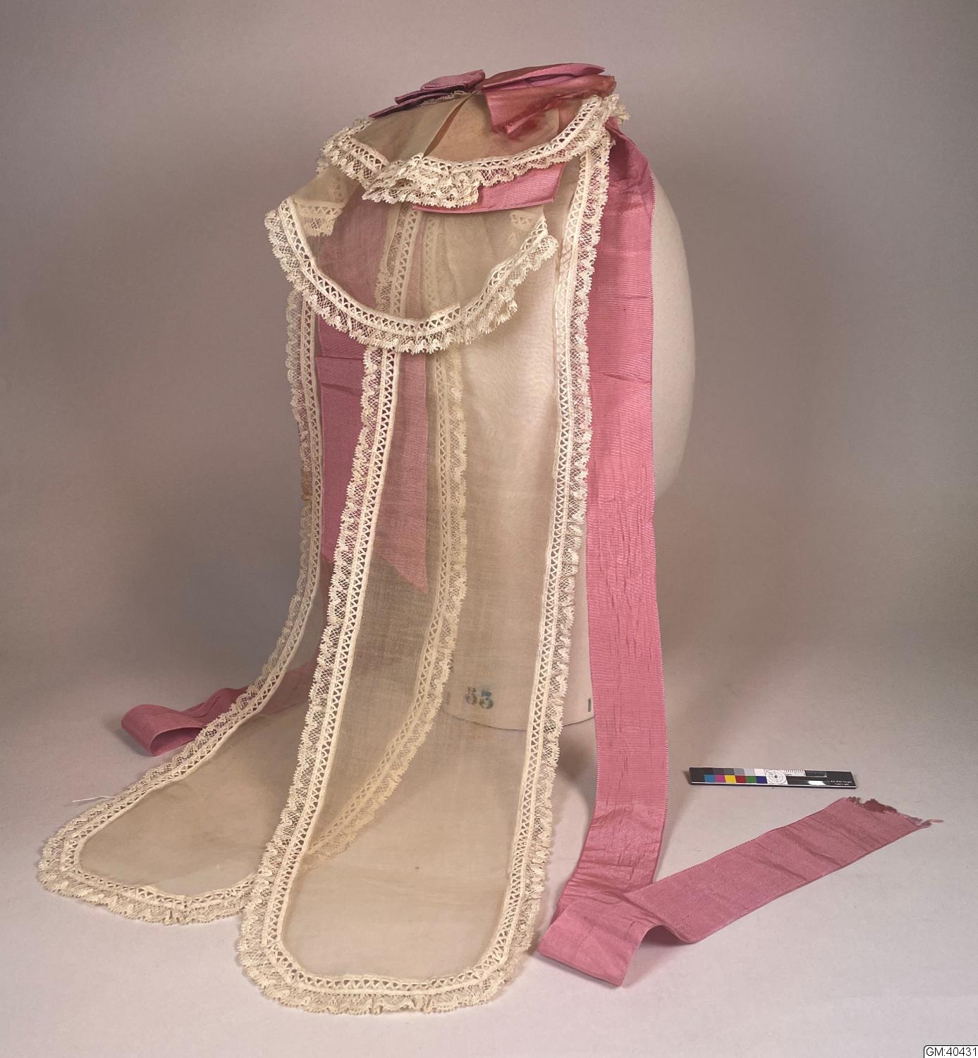 Hårklädsel av olika sammanfogade delar av spetskantad tarlatan samt dekorerad med malvalila band. Underst en triangel med rundade hörn och spetsen framåt. Nedåt nacken två remsor med halvrunda kortändar . Ovanpå dem upptill två veckade rundade stycken delvis om lott och överst en dubbel rosett. De färgade banden är dels långa hängande på sidorna dels infästa mellan tarlatanlagren :en bandögla och ett kortare bredare band.