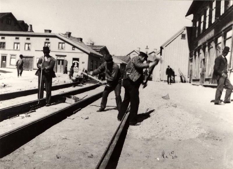 - Sträckningsbild av Karl Johansgatan mot öster. Rälsläggning vid Kusttorget för den nya spårvagnslinjen.
