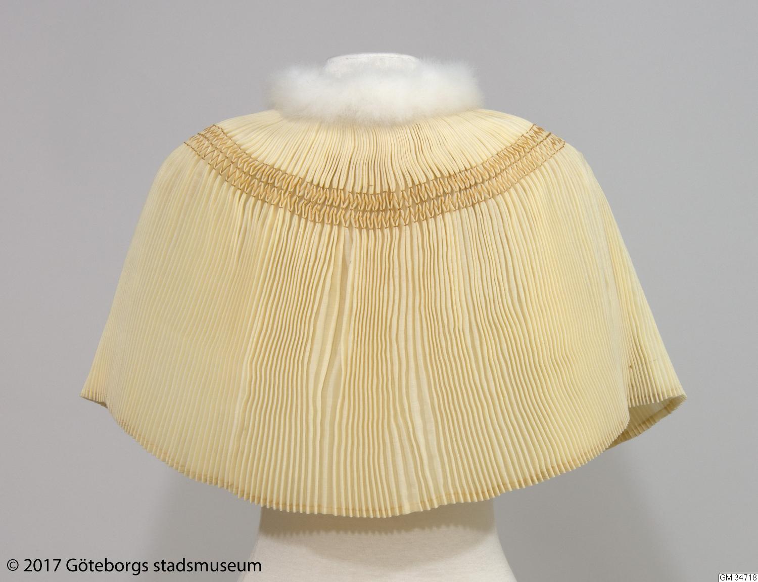 Pellerin, brudkrage, av benvitt ylle med kritvitt svandun runt halslinningen. Plissé sammanhållen av smockbroderi av guldfärgat moulinégarn. Knäpps hela vägen med hyskor och hakar.