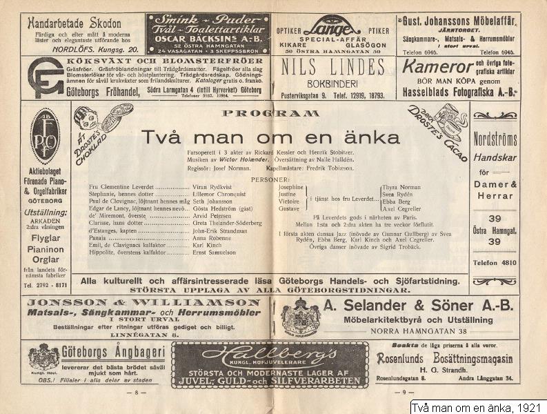 - Finns två programblad, i det andra listas Gösta Hedström och Lillemor Chronquist (Edgar de Lancy respektive Stephanie), dock nämns detta inte i någon recension (vilket är brukligt vid gästspel och liknande).