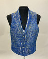 Herrväst i blå bomullsbrokad med ockrafärgat mönster. Västen har rundade slag, ryggstycke i enfärgat blått och knäppes med flera knappar mitt fram. /aan 2014-01-09