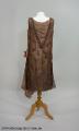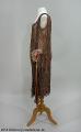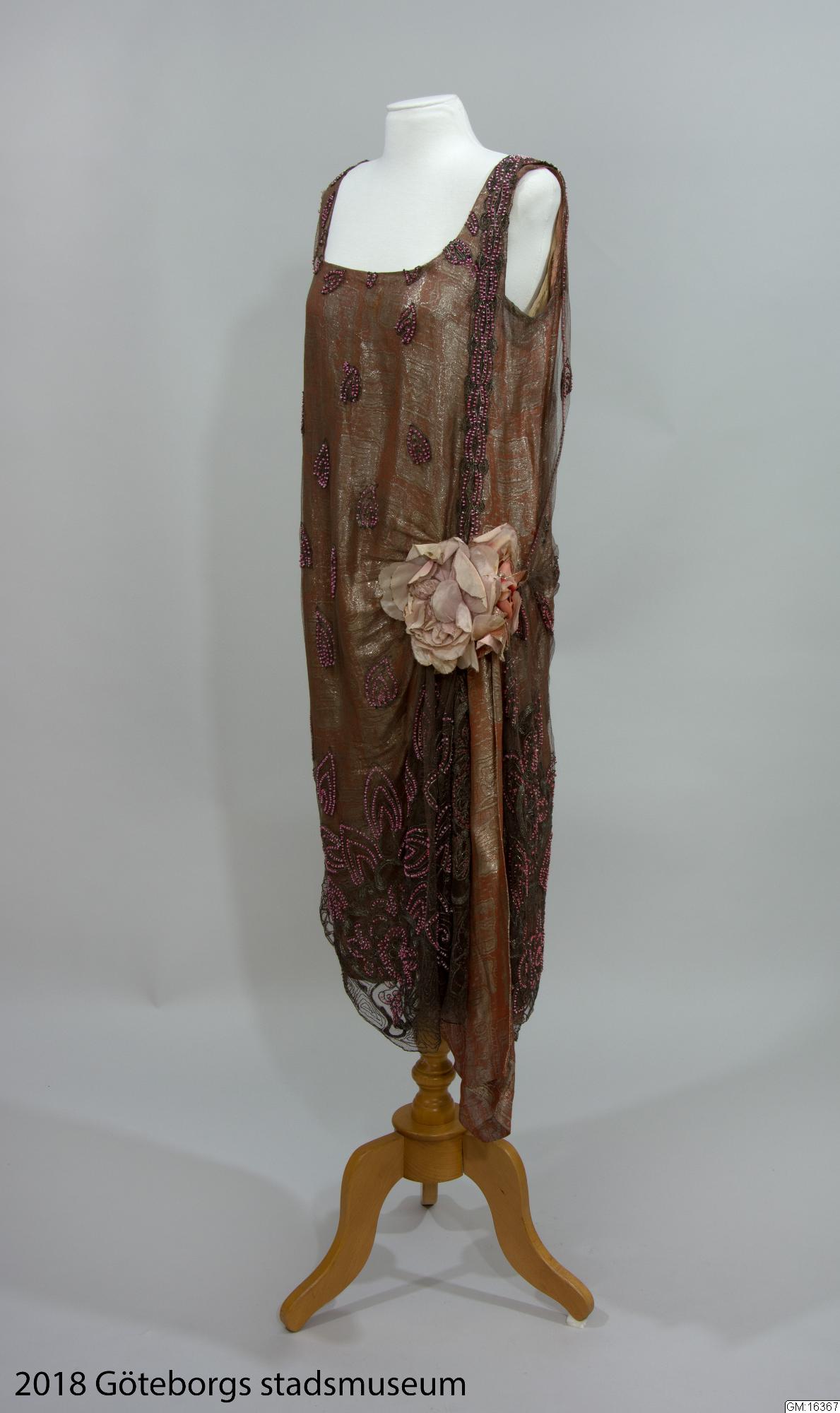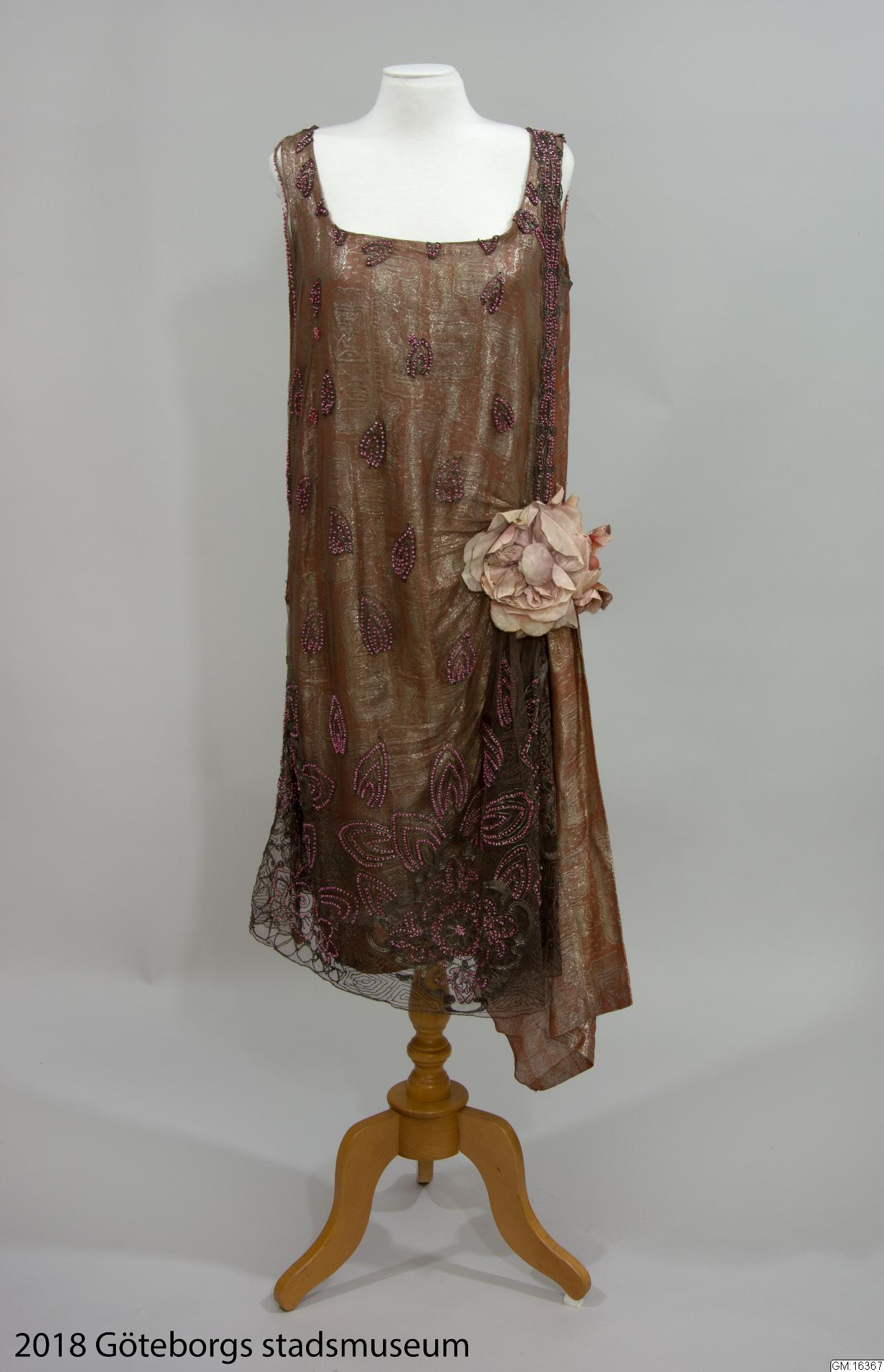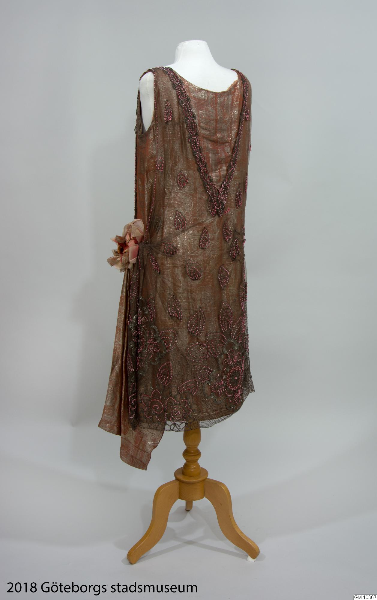 - Från katalogkort: Klänning av laxfärgad brokad med invävt mönster i silver, som utgör underklänning; ovanklänning av brun tyll med broderier i pärlor och silvertråd; garnering med i vänster sida hängandeskärpändar av tyget och rosafärgade och violetta tygblommor. Längd 110-124 cm.