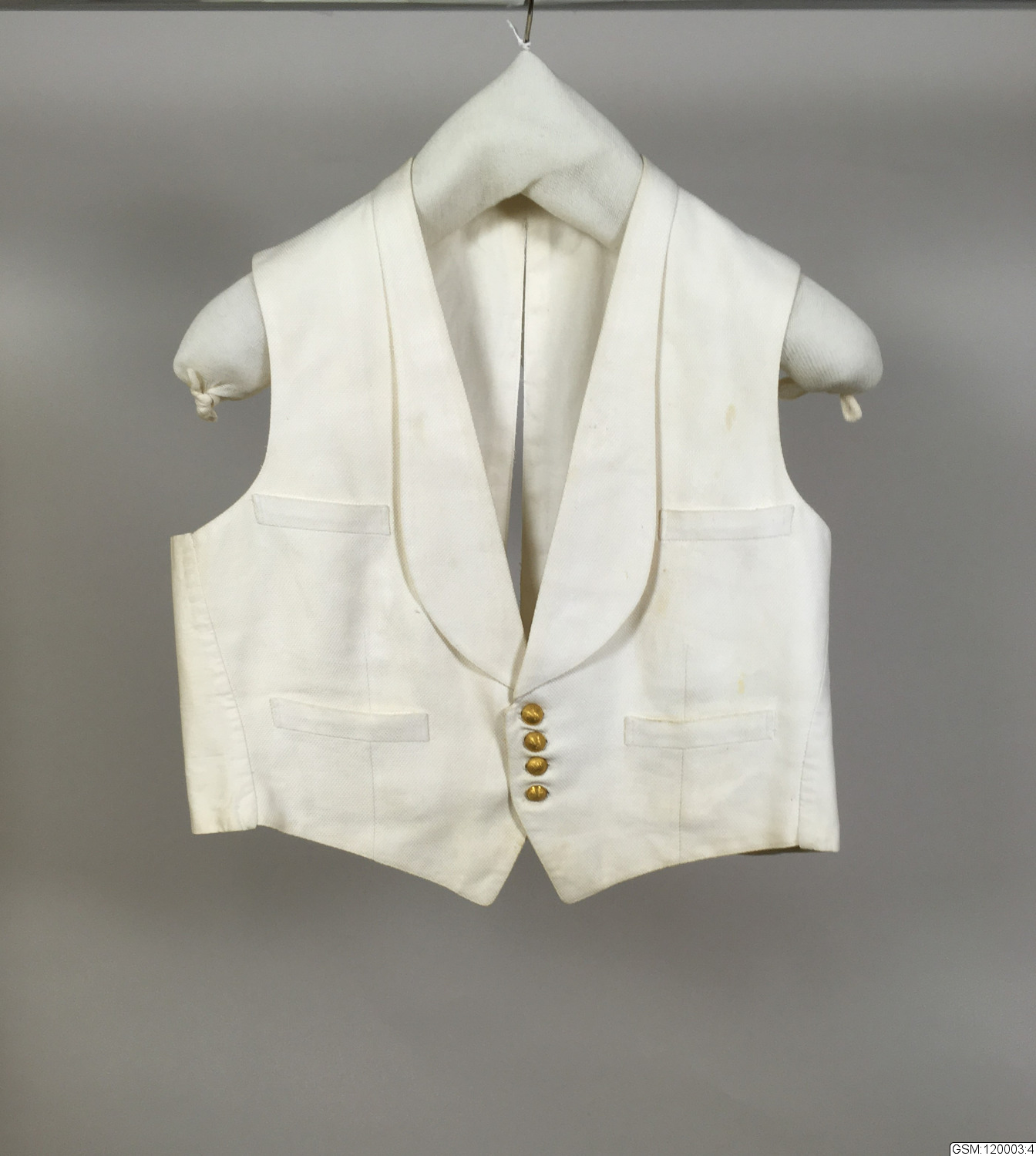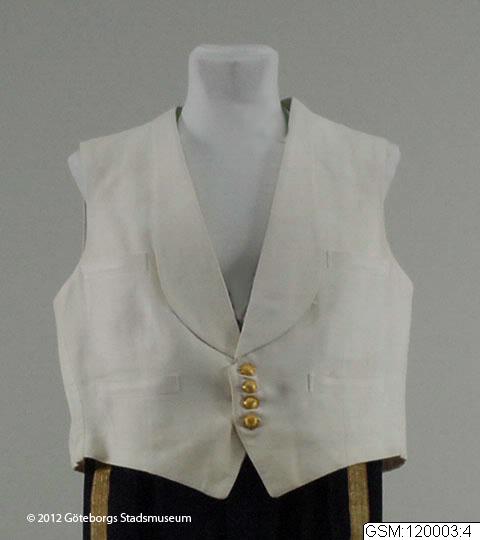 vit väst, med guldknappar, av bommulspiké, tillhörande mässdräkt för officer vid flygvapnet.