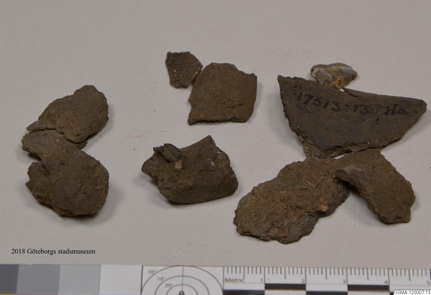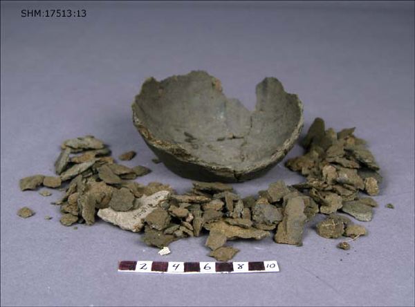 - ca 100 keramikskärvor botten är ihopatt. En notering på papper i fyndasken "Nr 13 inv. 17513:13. Urna med ett öra. Hel vid inpackningen med undantag av att övre kanten var intryckt av täckstenen. Av de medföljande skärvorna höra en del till urnan. Ramlade av vid upptagningen. Den å teckningen synliga täckstene (den stora) och resta lilla stenen förvaras."