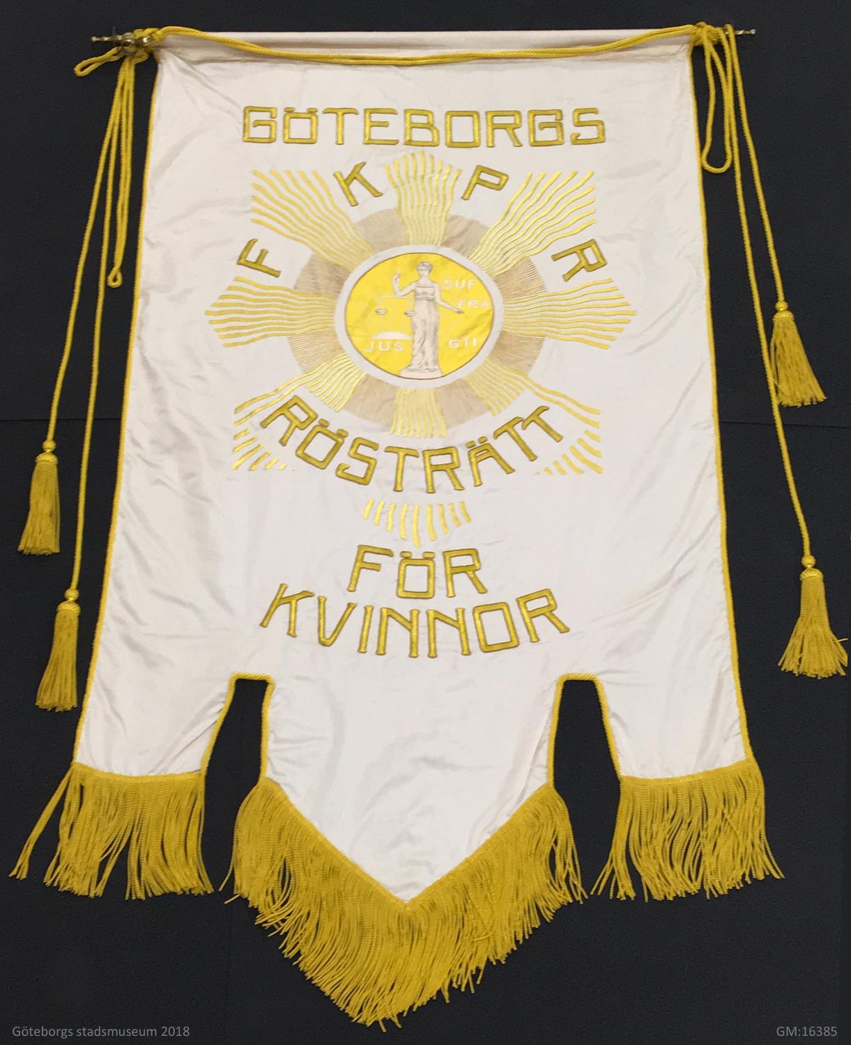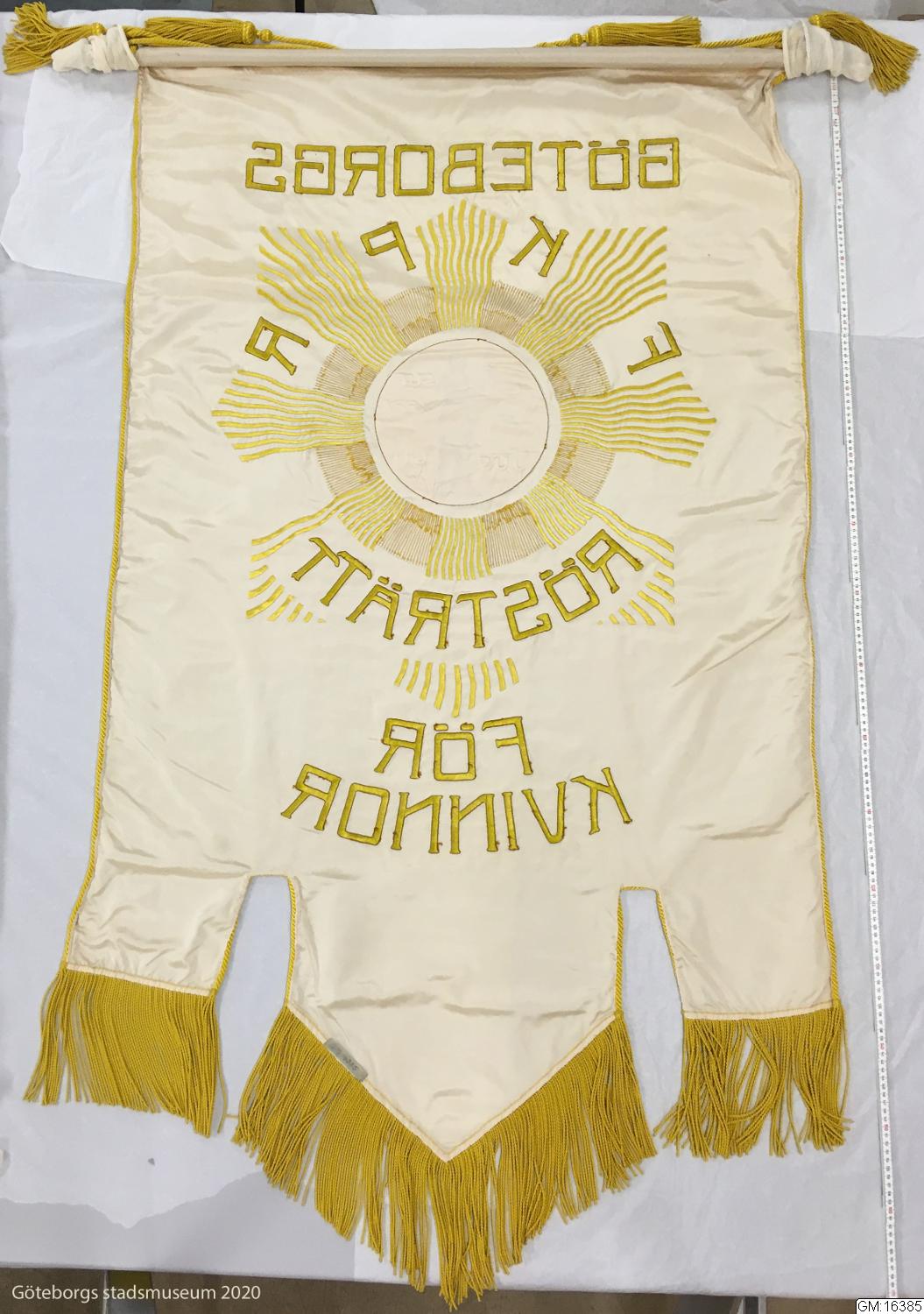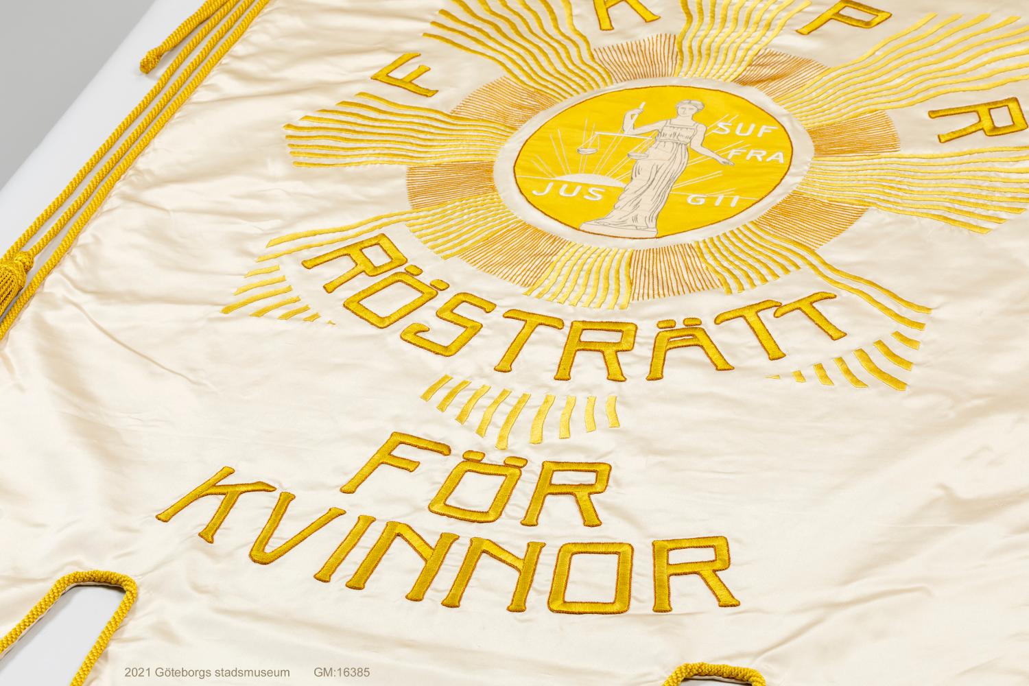 [Grejen med Göteborg, 2021]This standard was used at a demonstration for women’s right to vote on 2 June 1918. Later that same year, the Riksdag took the first step towards universal and equal suffrage.
