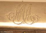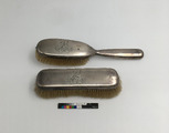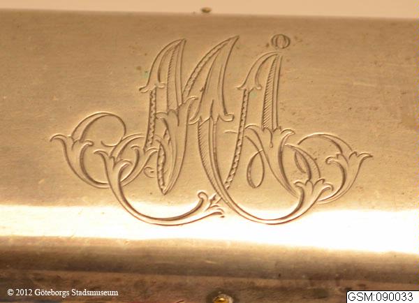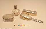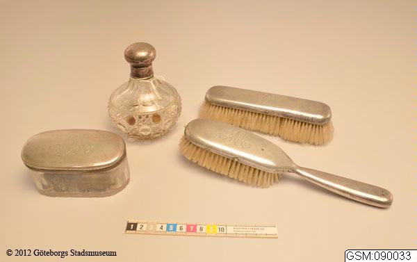Toilettset i fyra delar. Flaska och ask i kristall och silver. Borstar i silver. Samtliga delar graverade med monogramet "M Å".
